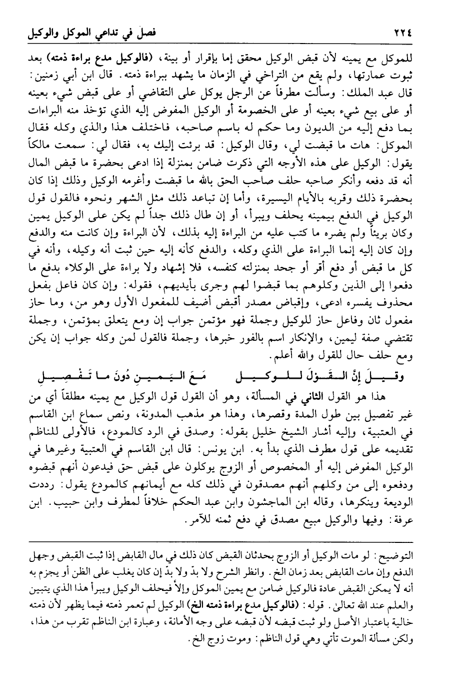 قال ابن أبي زمنين قال عبد الملك وسألت مطرفا عن الرجل يوكل على التقاضي أو على قبض شيء بعينه أو على بيع شيء بعينه أو على الخصومة أو الوكيل المفوض إليه الذي تؤخذ منه البراءات بما دفع إليه من الديون وما حكم له باسم صاحبه فاختلف هذا والذي وكله فقال الموكل هات ما قبضت لي وقال الوكيل قد برئت إليك به فقال لي سمعت مالكا يقول الوكيل على هذه الأوجه التي ذكرت ضامن بمنزلة إذا ادعى بحضرة ما قبض المال أنه قد دفعه وأنكر صاحبه حلف صاحب الحق بالله ما قبضت وأغرمه الوكيل