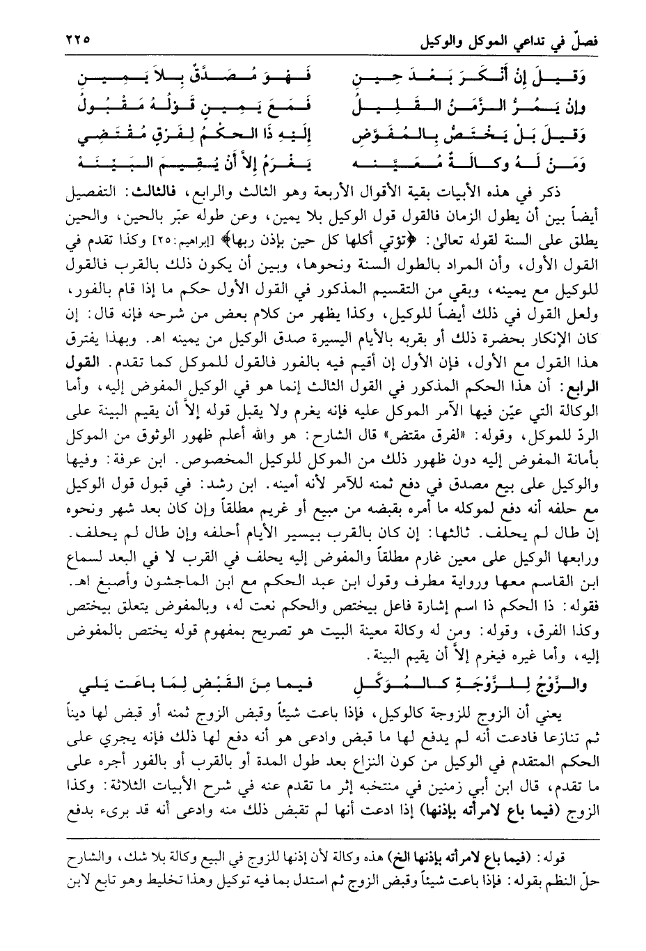 وفيها والوكيل على بيع مصدق في دفع ثمنه للآمر لأنه أمينه ابن رشد في قبول قول الوكيل مع حلفه أنه دفع لموكله ما أمره بقبضه من مبيع أو غريم مطلقا وإن كان بعد شهر ونحوه إن طال لم يحلف ثالثها إن كان بالقرب بيسير الأيام أحلفه وإن طال لم يحلف ورابعها الوكيل على معين غارم مطلقا والمفوض إليه يحلف في القرب لا في البعد لسماع ابن القاسم معها ورواية مطرف وقول ابن عبد الحكم مع ابن الماجشون وأصبغ ا هـ فقوله ذا الحكم ذا اسم إشارة فاعل بيختص والحكم نعت له وبالمفوض يتعلق بيختص وكذا الفرق وقوله ومن له وكالة معينه البيت