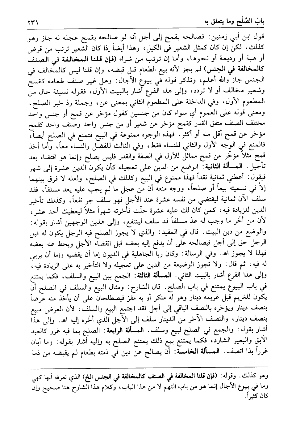 وتذكر قوله في بيوع الآجال وهل غير صنف طعامه كقمح وشعير مخالف أو لا تردد وإلى هذا الفرع أشار بالبيت الأول فقوله نسيئة حال من المطعوم الأول وفي الداخلة على المطعوم الثاني بمعنى عن وجملة رد خبر الصلح ومعنى قوله على العموم أي سواء كان من جنسين كفول مؤخر عن قمح أو جنس واحد مختلف الصنف متفق القدر كقمح مؤخر عن شعير أو من جنس واحد وصنف واحد كقمح مؤخر عن قمح أقل منه أو أكثر فهذه الوجوه ممنوعة في البيع فتمنع في الصلح أيضا فالمنع في الوجه الأول والثاني للنساء فقط وفي الثالث للفضل والنساء معا وأما أخذ قمح مثلا مؤخر عن قمح مماثل للأول في الصفة والقدر فليس بصلح وإنما هو اقتضاء بعد تأجيل