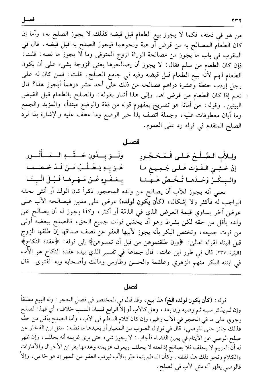 فصل وللأب الصلح على المحجور ولو بدون حقه المأثور إن خشي الفوت على جميع ما هو به يطلب من قد خصما والبكر وحدها تخص هاهنا بعفوه عن مهرها قبل البنا يعني أنه يجوز للأب أن يصالح عن ولده المحجور ذكرا كان الولد أو أنثى بحقه الواجب له فأكثر ولا إشكال كأن يكون لولده عرض على مدين فيصالحه الأب على عرض آخر يساوي قيمة العرض الذي في الذمة أو أكثر وكذا يجوز له أن يصالح عن ولده بأقل من حقه لكن بشرط وهو أن يخشى فوات جميع الحق فالصلح ببعضه أولى من فوت جميعه وتختص البكر بأنه يجوز لأبيها العفو عن نصف صداقها إن طلقها الزوج قبل البناء لقوله تعالى وإن طلقتموهن من قبل أن تمسوهن إلى قوله عقدة النكاح قال في طرر ابن عات قال جماعة في تفسير الذي بيده عقدة النكاح هو الأب في ابنته البكر منهم الزهري وعلقمة والحسن وطاوس ومالك وأصحابه وبه الفتوى قال