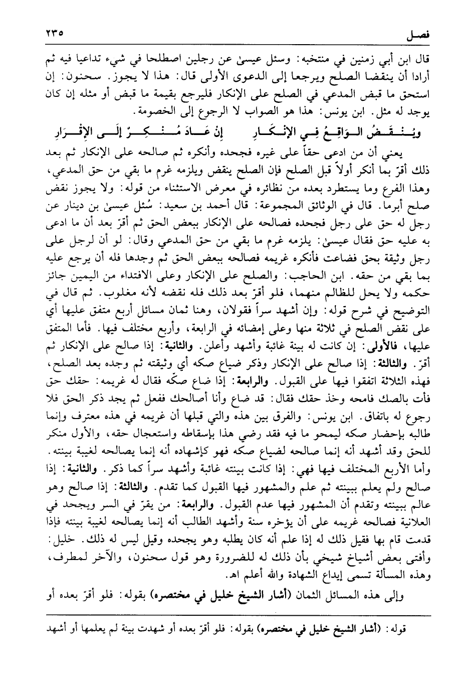 وإلى هذه المسائل الثمان أشار الشيخ خليل في مختصره بقوله فلو أقر بعده أو
