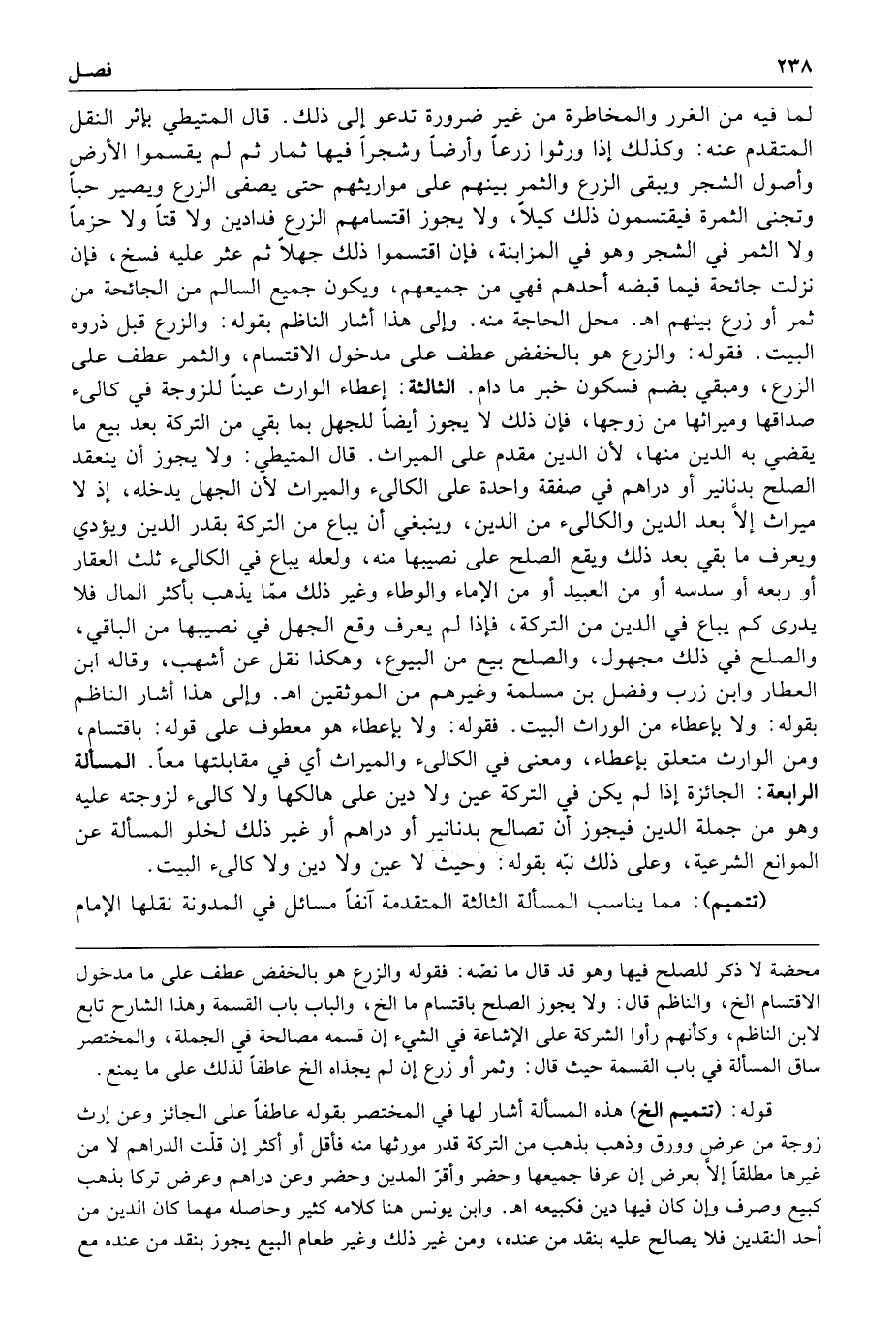 قال المتيطي ولا يجوز أن ينعقد الصلح بدنانير أو دراهم في صفقة واحدة على الكالئ والميراث لأن الجهل يدخله إذ لا ميراث إلا بعد الدين والكالئ من الدين وينبغي أن يباع من التركة بقدر الدين ويؤدى ويعرف ما بقي بعد ذلك ويقع الصلح على نصيبها منه ولعله يباع في الكالئ ثلث العقار أو ربعه أو سدسه أو من العبيد أو من الإماء والوطاء وغير ذلك مما يذهب بأكثر المال فلا يدري كم يباع في الدين من التركة