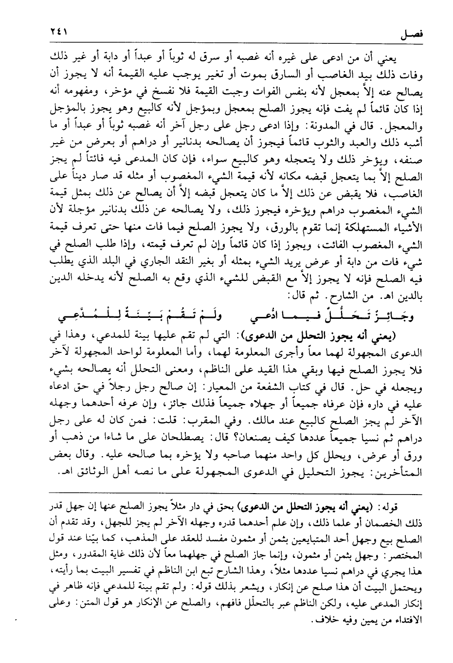 من الشارح ثم قال وجائز تحلل فيما ادعي ولم تقم بينة للمدعي يعني أنه يجوز التحلل من الدعوى التي لم تقم عليها بينة للمدعي وهذا في الدعوى المجهولة لهما معا وأحرى المعلومة لهما