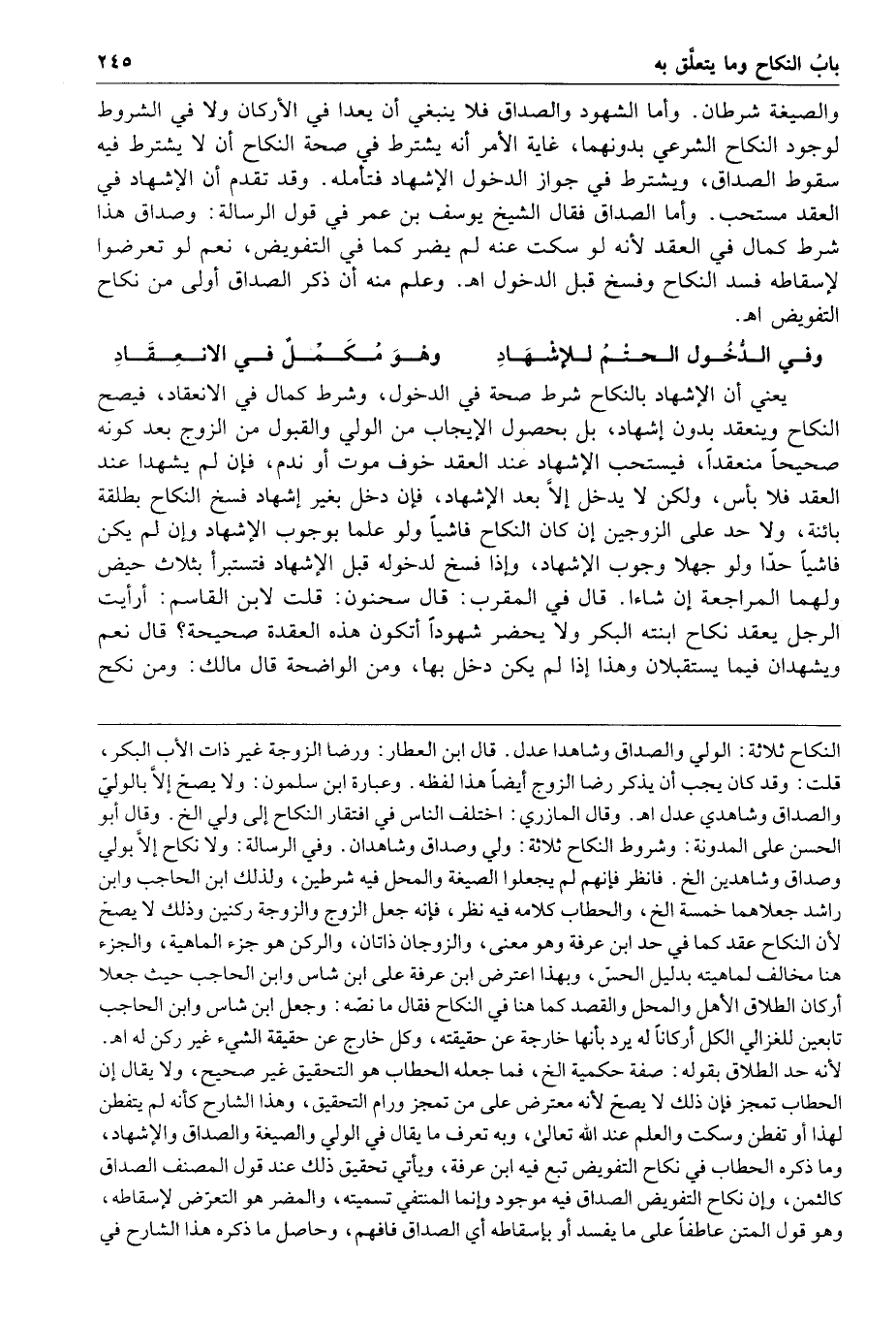 والصيغة شرطان وأما الشهود والصداق فلا ينبغي أن يعدا في الأركان ولا في الشروط لوجود النكاح الشرعي بدونهما غاية الأمر أنه يشترط في صحة النكاح أن لا يشترط فيه سقوط الصداق ويشترط في جواز الدخول الإشهاد فتأمله وقد تقدم أن الإشهاد في العقد مستحب وأما الصداق فقال الشيخ يوسف بن عمر في قول الرسالة وصداق هذا شرط كمال في العقد لأنه لو سكت عنه لم يضر كما في التفويض نعم لو تعرضوا لإسقاطه فسد النكاح وفسخ قبل الدخول ا هـ وعلم منه أن ذكر الصداق أولى من نكاح التفويض ا هـ