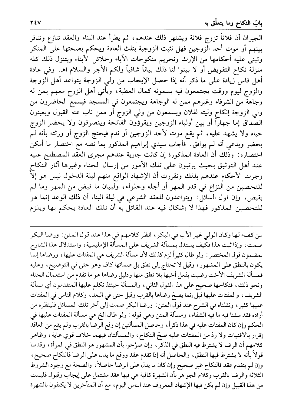 وفي عادة أهل فاس زيادة على ما ذكر أنه إذا حصل الإيجاب من ولي الزوجة يتواعد أهل الزوجة والزوج ليوم ووقت يجتمعون فيه يسمونه كمال العطية ويأتي أهل الزوج معهم بمن له وجاهة من الشرفاء وغيرهم ممن له الوجاهة ويجتمعون في المسجد فيسمع الحاضرون من ولي الزوجة إنكاح وليته لفلان ويسمعون من ولي الزوج أو ممن ناب عنه القبول ويعينون الصداق إما جهارا أو بين أولياء الزوجين ويقرؤون الفاتحة وينصرفون ولا يحضر الزوج حياء ولا يشهد عليه ثم يقع موت لأحد الزوجين أو ندم فيحتج الزوج أو ورثته بأنه لم يحضر ويدعي أنه لم يوافق