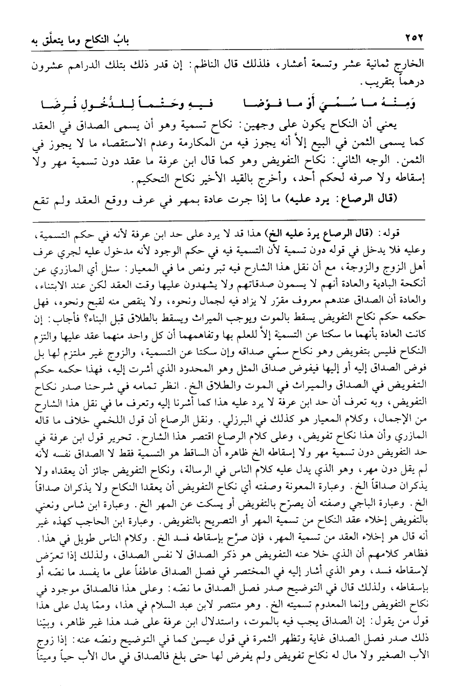الخارج ثمانية عشر وتسعة أعشار فلذلك قال الناظم إن قدر ذلك بتلك الدراهم عشرون درهما بتقريب ومنه ما سمي أو ما فوضا فيه وحتما للدخول فرضا يعني أن النكاح يكون على وجهين نكاح تسمية وهو أن يسمي الصداق في العقد كما يسمي الثمن في البيع إلا أنه يجوز فيه من المكارمة وعدم الاستقصاء ما لا يجوز في الثمن الوجه الثاني نكاح التفويض وهو كما قال ابن عرفة ما عقد دون تسمية مهر ولا إسقاطه ولا صرفه لحكم أحد وأخرج بالقيد الأخير نكاح التحكيم قال الرصاع يرد عليه ما إذا جرت عادة بمهر في عرف ووقع العقد ولم تقع