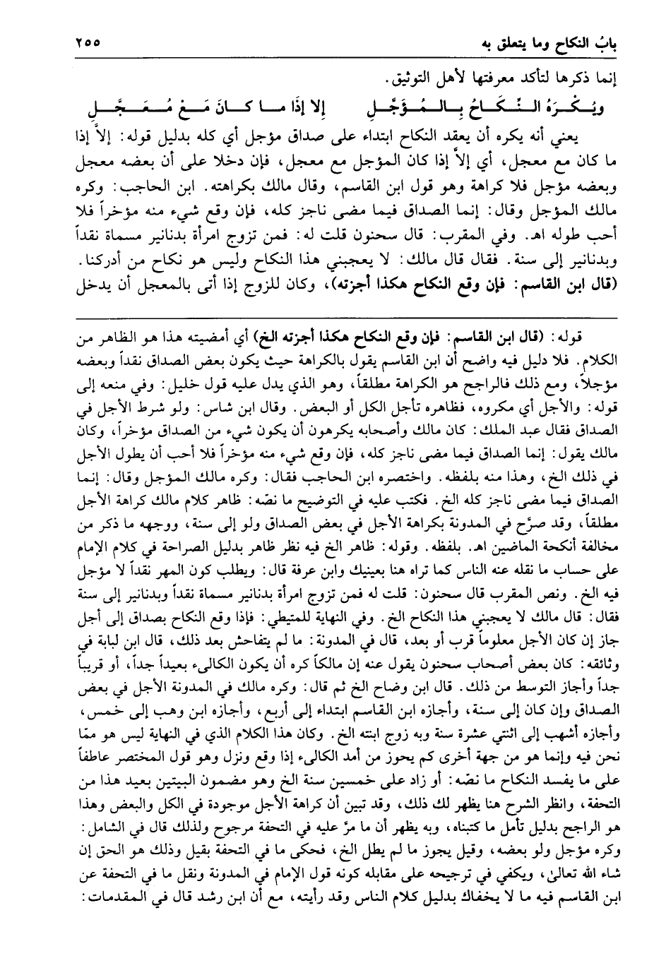 إنما ذكرها لتأكد معرفتها لأهل التوثيق ويكره النكاح بالمؤجل إلا إذا ما كان مع معجل يعني أنه يكره أن يعقد النكاح ابتداء على صداق مؤجل أي كله بدليل قوله إلا إذا ما كان مع معجل أي إلا إذا كان المؤجل مع معجل فإن دخلا على أن بعضه معجل وبعضه مؤجل فلا كراهة وهو قول ابن القاسم وقال مالك بكراهته ابن الحاجب وكره مالك المؤجل وقال إنما الصداق فيما مضى ناجز كله فإن وقع شيء منه مؤخرا فلا أحب طوله