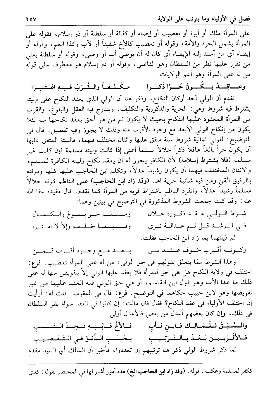 وعاقد يكون حرا ذكرا مكلفا والقرب فيه اعتبرا تقدم أن الولي أحد أركان النكاح وذكر هنا أن الولي الذي يعقد النكاح على وليته يشترط فيه شروط وهي الحرية والذكورية والتكليف ويندرج فيه العقل والبلوغ والقرب من المرأة المعقود عليها النكاح بحيث لا يكون ثم من هو أحق بعقد نكاحها منه لئلا يكون من إنكاح الولي الأبعد مع وجود الأقرب منه وذلك لا يجوز وفيه تفصيل قال في التوضيح للولي ثمانية شروط ستة متفق عليها واثنان مختلف فيهما فالستة المتفق عليها أن يكون حرا بالغا عاقلا ذكرا حلالا مسلما أعني إذا كانت وليته مسلمة فإن كانت غير مسلمة فلا يشترط إسلامه لأن الكافر يجوز له أن يعقد نكاح وليته الكافرة لمسلم والاثنان المختلف فيهما أن يكون رشيدا عدلا وتكلم ابن الحاجب عليها كلها ومراده بالرقيق القن ومن فيه شائبة حرية ا هـ وقد زاد ابن الحاجب على الناظم كونه حلالا مسلما رشيدا عدلا وانفرد الناظم باشتراط قربه من المرأة كما تقدم قال مقيده عفا الله عنه وقد كنت جمعت الشروط المذكورة في التوضيح في بيتين وهما