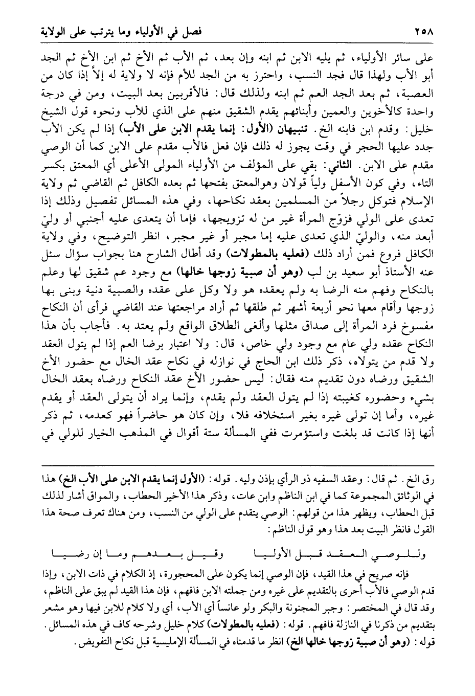 على سائر الأولياء ثم يليه الابن ثم ابنه وإن بعد ثم الأب ثم الأخ ثم ابن الأخ ثم الجد أبو الأب ولهذا قال فجد النسب واحترز به من الجد للأم فإنه لا ولاية له إلا إذا كان من العصبة ثم بعد الجد العم ثم ابنه ولذلك قال فالأقربين بعد البيت ومن في درجة واحدة كالأخوين والعمين وأبنائهم يقدم الشقيق منهم على الذي للأب ونحوه قول الشيخ خليل وقدم ابن فابنه إلخ تنبيهان الأول إنما يقدم الابن على الأب إذا لم يكن الأب جدد عليها الحجر في وقت يجوز له ذلك فإن فعل فالأب مقدم على الابن كما أن الوصي مقدم على الابن الثاني بقي على المؤلف من الأولياء المولى الأعلى أي المعتق بكسر التاء وفي كون الأسفل وليا قولان وهوالمعتق بفتحها ثم بعده الكافل ثم القاضي ثم ولاية الإسلام فتوكل رجلا من المسلمين بعقد نكاحها وفي هذه المسائل تفصيل وذلك إذا تعدي على الولي فزوج المرأة غير من له تزويجها فأما أن يتعدى عليه أجنبي أو ولي أبعد منه والولي الذي تعدي عليه إما مجبر أو غير مجبر انظر التوضيح وفي ولاية الكافل فروع فمن أراد ذلك فعليه بالمطولات