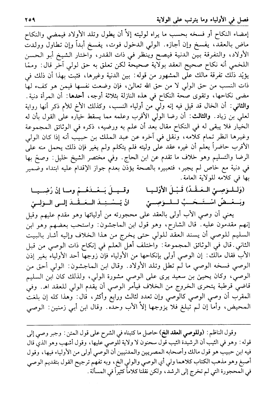 وللوصي العقد قبل الأوليا وقيل بعدهم وما إن رضيا وبعض استحب للوصي أن يسند العقد إلى الولي يعني أن وصي الأب أولى بالعقد على محجورته من أوليائها وهو مقدم عليهم وقيل إنهم مقدمون عليه قال الشارح وهو قول ابن الماجشون واستحب بعضهم وهو ابن السليم للوصي أن يسند العقد للولي حتى يخرج من هذا الخلاف وإليه أشار بالبيت الثاني قال في الوثائق المجموعة واختلف أهل العلم في إنكاح ذات الوصي من قبل الأب فقال مالك إن الوصي أولى بإنكاحها من الأولياء فإن زوجها أحد الأولياء بغير إذن الوصي فسخه الوصي ما لم تطل وتلد الأولاد وقال ابن الماجشون الولي أحق من الوصي وكان يحيى بن سعيد يرى على الوصي مشورة الولي ولذلك كان ابن السليم قاضي قرطبة يتحرى الخروج من الخلاف فيأمر الوصي أن يقدم الولي للعقد ا هـ وفي المقرب أن وصي الوصي كالوصي وإن تعدد لثالث ورابع وأكثر قال وهذا كله إن بلغت المحيض وأما إن لم تبلغ فلا يزوجها إلا الأب وحده وقال ابن أبي زمنين الوصي