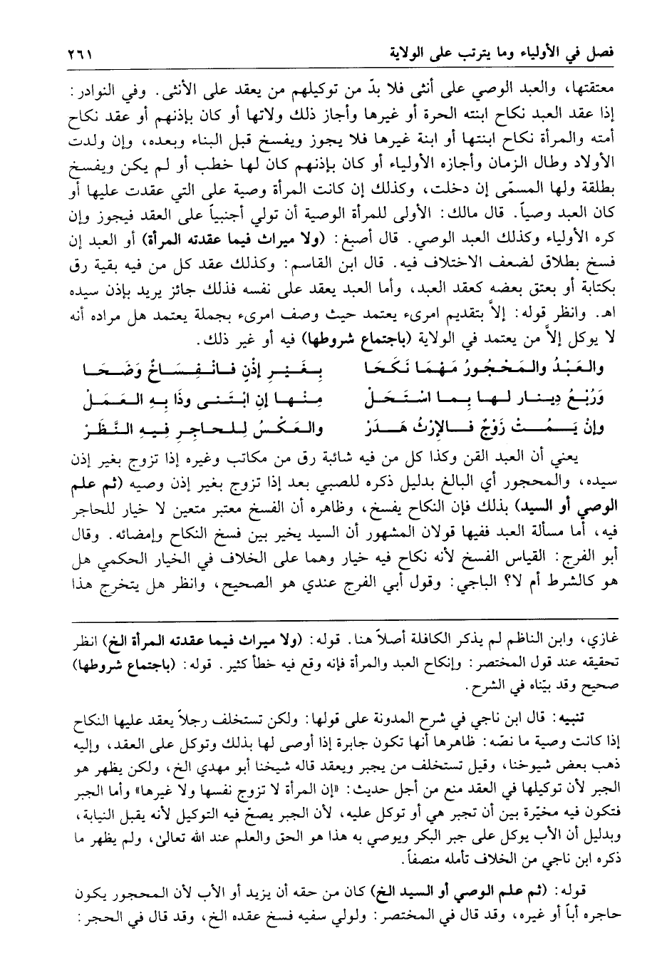والعبد والمحجور مهما نكحا بغير إذن فانفساخ وضحا وربع دينار لها بما استحل منها إن ابتنى وذا به العمل وإن يمت زوج فالإرث هدر والعكس للحاجر فيه النظر يعني أن العبد القن وكذا كل من فيه شائبة رق من مكاتب وغيره إذا تزوج بغير إذن سيده والمحجور أي البالغ بدليل ذكره للصبي بعد إذا تزوج بغير إذن وصيه ثم علم الوصي أو السيد بذلك فإن النكاح يفسخ وظاهره أن الفسخ معتبر متعين لا خيار للحاجر فيه أما مسألة العبد ففيها قولان المشهور أن السيد يخير بين فسخ النكاح وإمضائه وقال أبو الفرج القياس الفسخ لأنه نكاح فيه خيار وهما على الخلاف في الخيار الحكمي هل هو كالشرط أم لا الباجي وقول أبي الفرج عندي هو الصحيح وانظر هل يتخرج هذا