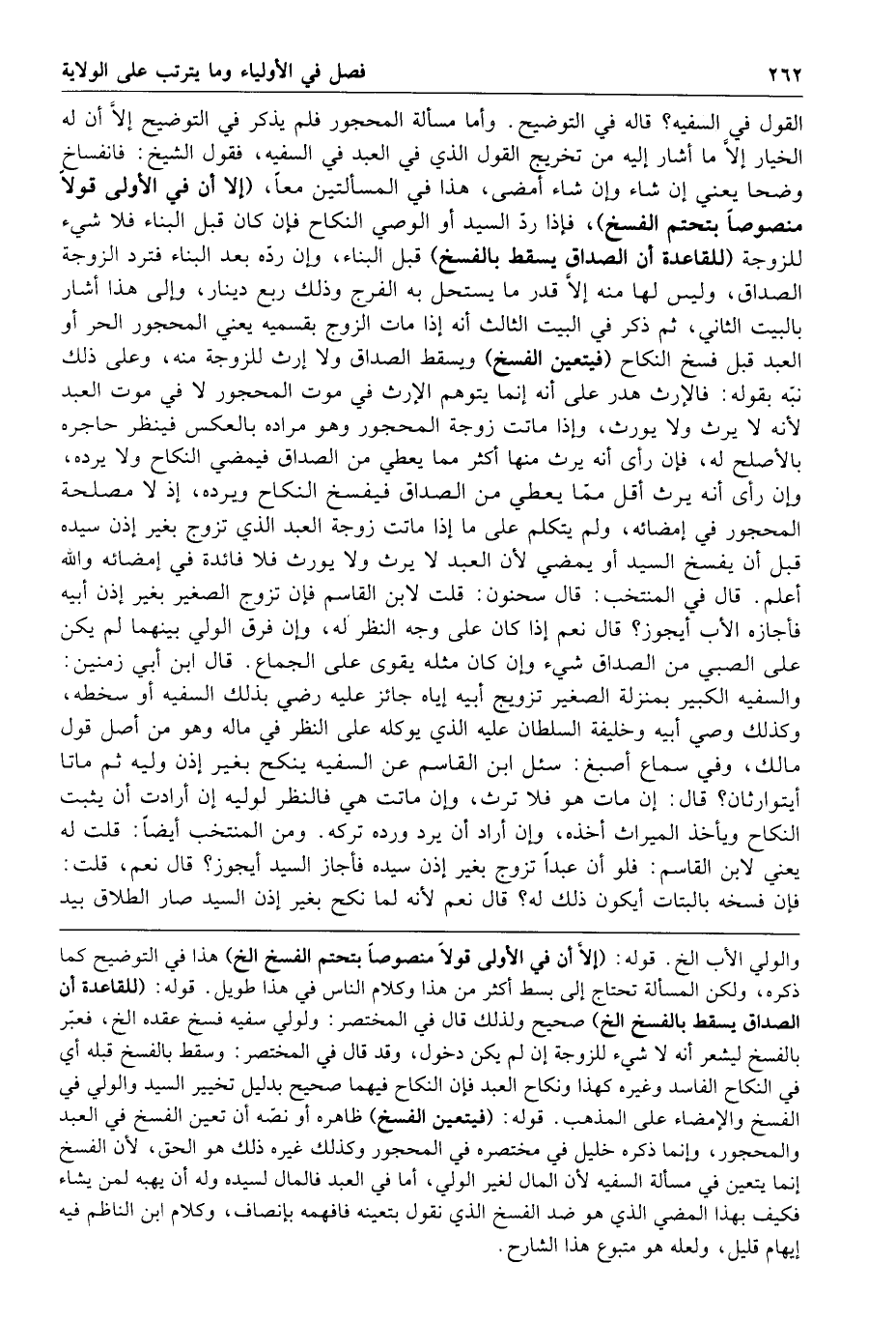 القول في السفيه قاله في التوضيح وأما مسألة المحجور فلم يذكر في التوضيح إلا أن له الخيار إلا ما أشار إليه من تخريج القول الذي في العبد في السفيه فقول الشيخ فانفساخ وضحا يعني إن شاء وإن شاء أمضى هذا في المسألتين معا إلا أن في الأولى قولا منصوصا بتحتم الفسخ فإذا رد السيد أو الوصي النكاح فإن كان قبل البناء فلا شيء للزوجة للقاعدة أن الصداق يسقط بالفسخ قبل البناء وإن رده بعد البناء فترد الزوجة الصداق وليس لها منه إلا قدر ما يستحل به الفرج وذلك ربع دينار وإلى هذا أشار بالبيت الثاني