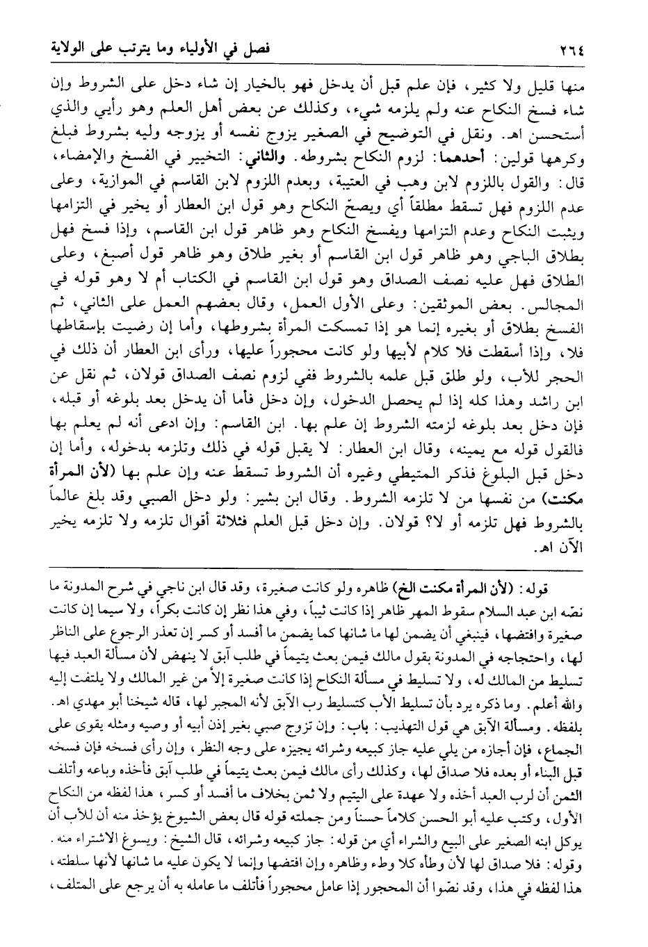 منها قليل ولا كثير فإن علم قبل أن يدخل فهو بالخيار إن شاء دخل على الشروط وإن شاء فسخ النكاح عنه ولم يلزمه شيء وكذلك عن بعض أهل العلم وهو رأيي والذي أستحسن ا هـ ونقل في التوضيح في الصغير يزوج نفسه أو يزوجه وليه بشروط فبلغ وكرهها قولين أحدهما لزوم النكاح بشروطه والثاني التخيير في الفسخ والإمضاء قال والقول باللزوم لابن وهب في العتيبة وبعدم اللزوم لابن القاسم في الموازية وعلى عدم اللزوم فهل تسقط مطلقا أي ويصح النكاح وهو قول ابن العطار أو يخير في التزامها ويثبت النكاح وعدم التزامها ويفسخ النكاح وهو ظاهر قول ابن القاسم