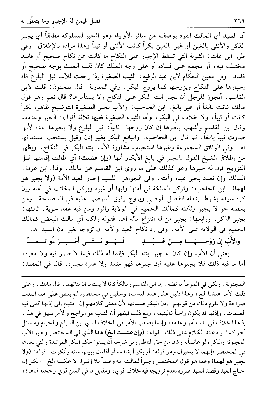 أن السيد أي المالك انفرد بوصف عن سائر الأولياء وهو الجبر لمملوكه مطلقا أي يجبر الذكر والأنثى بالغين أو غير بالغين بكرا كانت الأنثى أو ثيبا وهذا مراده بالإطلاق وفي طرر ابن عات الثيوبة التي تسقط الإجبار على النكاح ما كانت عن نكاح صحيح أو فاسد مختلف فيه أو مجمع على فساده أو على وجه الملك كان ذلك الملك بوجه صحيح أو فاسد