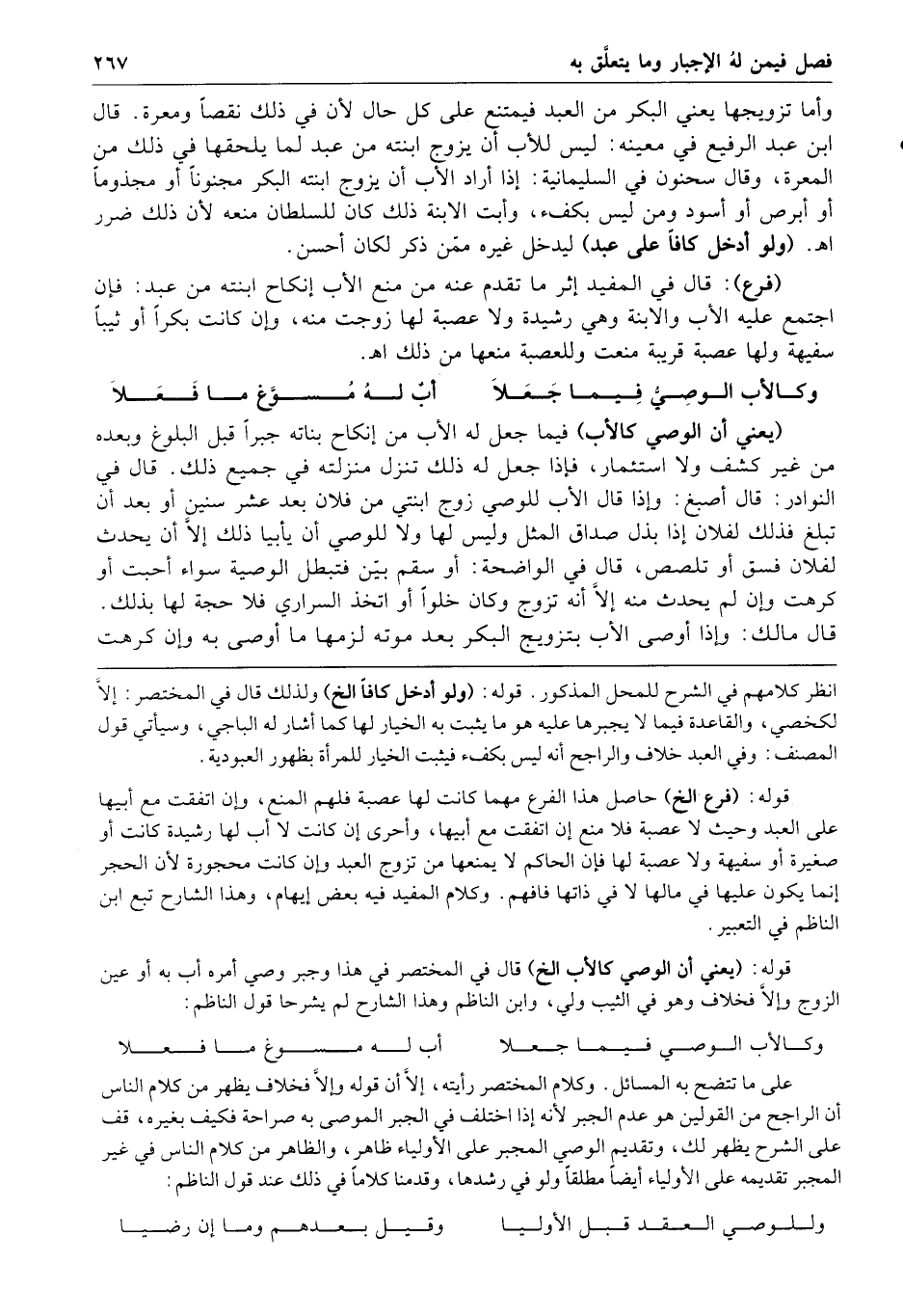 وكالأب الوصي فيما جعلا أب له مسوغ ما فعلا يعني أن الوصي كالأب فيما جعل له الأب من إنكاح بناته جبرا قبل البلوغ وبعده من غير كشف ولا استئمار فإذا جعل له ذلك تنزل منزلته في جميع ذلك قال في النوادر قال أصبغ وإذا قال الأب للوصي زوج ابنتي من فلان بعد عشر سنين أو بعد أن تبلغ فذلك لفلان إذا بذل صداق المثل وليس لها ولا للوصي أن يأبيا ذلك إلا أن يحدث لفلان فسق أو تلصص قال في الواضحة أو سقم بين فتبطل الوصية سواء أحبت أو كرهت وإن لم يحدث منه إلا أنه تزوج وكان خلوا أو اتخذ السراري فلا حجة لها بذلك قال مالك وإذا أوصى الأب بتزويج البكر بعد موته لزمها ما أوصى به وإن كرهت