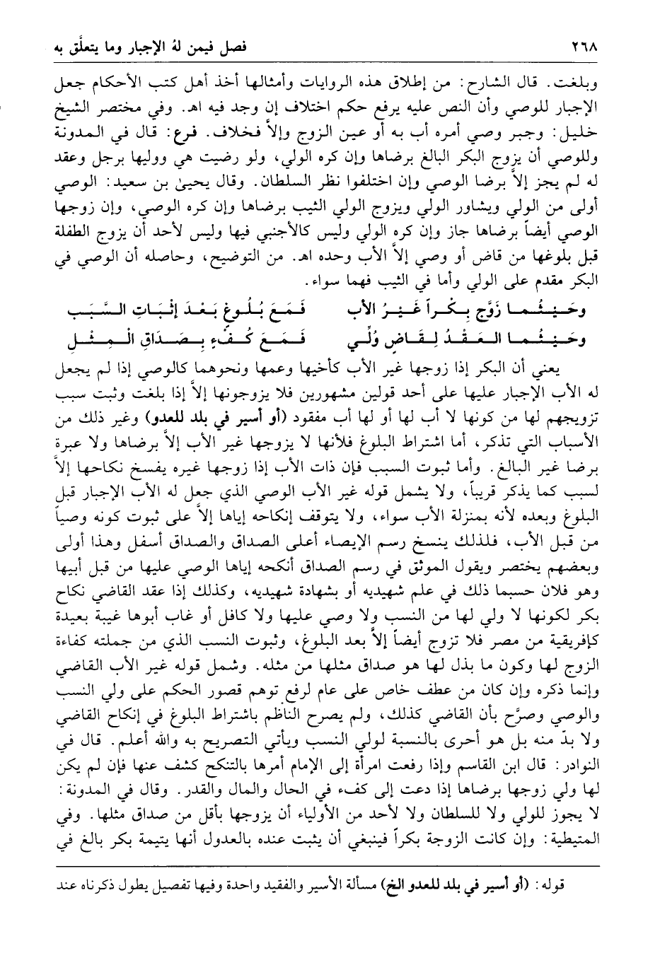 ا هـ وفي مختصر الشيخ خليل وجبر وصي أمره أب به أو عين الزوج وإلا فخلاف فرع قال في المدونة وللوصي أن يزوج البكر البالغ برضاها وإن كره الولي ولو رضيت هي ووليها برجل وعقدا له لم يجز إلا برضا الوصي وإن اختلفوا نظر السلطان وقال يحيى بن سعيد الوصي أولى من الولي ويشاور الولي ويزوج الولي الثيب برضاها وإن كره الوصي وإن زوجها الوصي أيضا برضاها جاز وإن كره الولي وليس كالأجنبي فيها وليس لأحد أن يزوج الطفلة قبل بلوغها من قاض أو وصي إلا الأب وحده ا هـ من التوضيح وحاصله أن الوصي في البكر مقدم على الولي وأما في الثيب فهما سواء وحيثما زوج بكرا غير الأب فمع بلوغ بعد إثبات السبب وحيثما العقد لقاض ولي فمع كفء بصداق المثل يعني أن البكر إذا زوجها غير الأب كأخيها وعمها ونحوهما كالوصي إذا لم يجعل له الأب الإجبار عليها على أحد قولين مشهورين فلا يزوجونها إلا إذا بلغت وثبت سبب تزويجهم لها من كونها لا أب لها أو لها أب مفقود أو أسير في بلد للعدو وغير ذلك من الأسباب التي تذكر أما اشتراط البلوغ فلأنها لا يزوجها غير الأب إلا برضاها ولا عبرة برضا غير البالغ وأما ثبوت السبب فإن ذات الأب إذا زوجها غيره يفسخ نكاحها إلا لسبب كما يذكر قريبا ولا يشمل قوله غير الأب الوصي الذي جعل له الأب الإجبار قبل البلوغ وبعده لأنه بمنزلة الأب سواء ولا يتوقف إنكاحه إياها إلا على ثبوت كونه وصيا من قبل الأب فلذلك ينسخ رسم الإيصاء أعلى الصداق والصداق أسفل وهذا أولى وبعضهم يختصر ويقول الموثق في رسم الصداق أنكحه إياها الوصي عليها من قبل أبيها وهو فلان حسبما ذلك في علم شهيديه أو بشهادة شهيديه وكذلك إذا عقد القاضي نكاح بكر لكونها لا ولي لها من النسب ولا وصي عليها ولا كافل أو غاب أبوها غيبة بعيدة كإفريقية من مصر فلا تزوج أيضا إلا بعد البلوغ وثبوت النسب الذي من جملته كفاءة الزوج لها وكون ما بذل لها هو صداق مثلها من مثله وشمل قوله غير الأب القاضي وإنما ذكره وإن كان من عطف خاص على عام لرفع توهم قصور الحكم على ولي النسب والوصي وصرح بأن القاضي كذلك ولم يصرح الناظم باشتراط البلوغ في إنكاح القاضي ولا بد منه بل هو أحرى بالنسبة لولي النسب ويأتي التصريح به والله أعلم