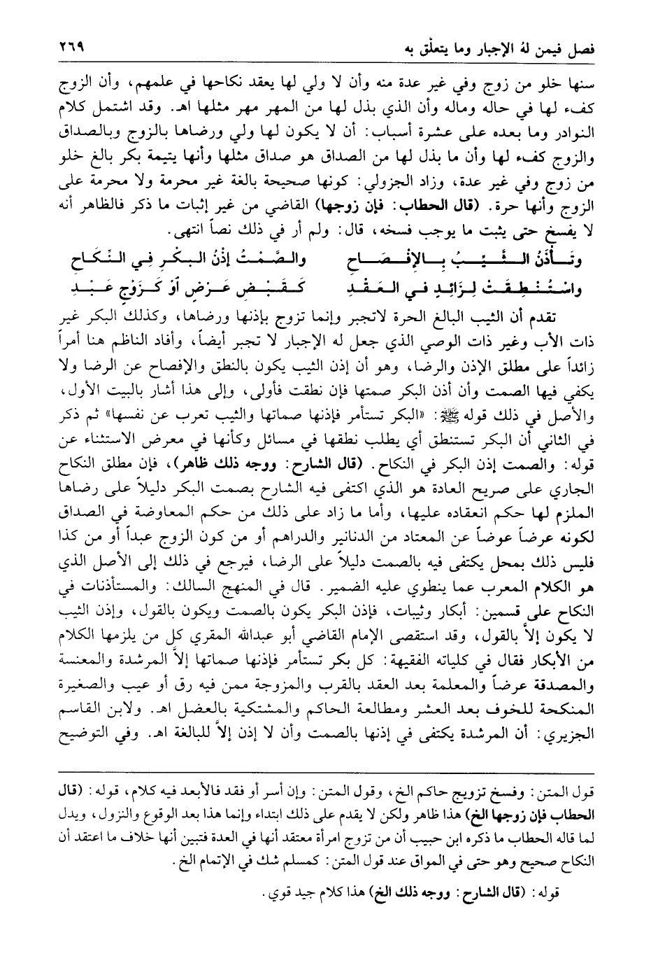 قال الحطاب فإن زوجها القاضي من غير إثبات ما ذكر فالظاهر أنه لا يفسخ حتى يثبت ما يوجب فسخه قال ولم أر في ذلك نصا انتهى وتأذن الثيب بالإفصاح والصمت إذن البكر في النكاح واستنطقت لزائد في العقد كقبض عرض أو كزوج عبد تقدم أن الثيب البالغ الحرة لاتجبر وإنما تزوج بإذنها ورضاها وكذلك البكر غير ذات الأب وغير ذات الوصي الذي جعل له الإجبار لا تجبر أيضا وأفاد الناظم هنا أمرا زائدا على مطلق الإذن والرضا وهو أن إذن الثيب يكون بالنطق والإفصاح عن الرضا ولا يكفي فيها الصمت وأن إذن البكر صمتها فإن نطقت فأولى وإلى هذا أشار بالبيت الأول والأصل في ذلك قوله صلى الله عليه وسلم البكر تستأمر فإذنها صماتها والثيب تعرب عن نفسها ثم ذكر في الثاني أن البكر تستنطق أي يطلب نطقها في مسائل وكأنها في معرض الاستثناء عن قوله والصمت إذن البكر في النكاح قال الشارح ووجه ذلك ظاهر فإن مطلق النكاح الجاري على صريح العادة هو الذي اكتفى فيه الشارح بصمت البكر دليلا على رضاها الملزم لها حكم انعقاده عليها وأما ما زاد على ذلك من حكم المعاوضة في الصداق لكونه عرضا عوضا عن المعتاد من الدنانير والدراهم أو من كون الزوج عبدا أو من كذا فليس ذلك بمحل يكتفى فيه بالصمت دليلا على الرضا فيرجع في ذلك إلى الأصل الذي هو الكلام المعرب عما ينطوي عليه الضمير قال في المنهج السالك والمستأذنات في النكاح على قسمين أبكار وثيبات فإذن البكر يكون بالصمت ويكون بالقول وإذن الثيب لا يكون إلا بالقول وقد استقصى الإمام القاضي أبو عبد الله المقري كل من يلزمها الكلام من الأبكار فقال في كلياته الفقيهة كل بكر تستأمر فإذنها صماتها إلا المرشدة والمعنسة والمصدقة عرضا والمعلمة بعد العقد بالقرب والمزوجة ممن فيه رق أو عيب والصغيرة المنكحة للخوف بعد العشر ومطالعة الحاكم والمشتكية بالعضل ا هـ