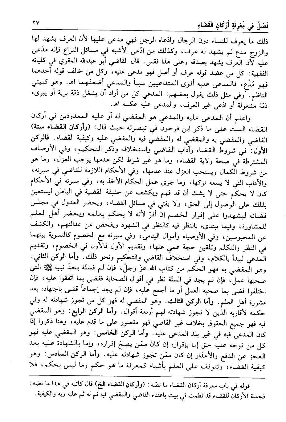 واعلم أن المدعى عليه والمدعي هو المقضي له أو عليه المعدودين في أركان القضاء الست على ما ذكر ابن فرحون في تبصرته حيث قال وأركان القضاء ستة القاضي والمقضي به والمقضي له والمقضي فيه والمقضي عليه وكيفية القضاء فالركن الأول في شروط القضاء وآداب القاضي واستخلافه وذكر التحكيم وفي الأوصاف المشترطة في صحة ولاية القضاء وما هو غير شرط لكن عدمها يوجب العزل وما هو من شروط الكمال