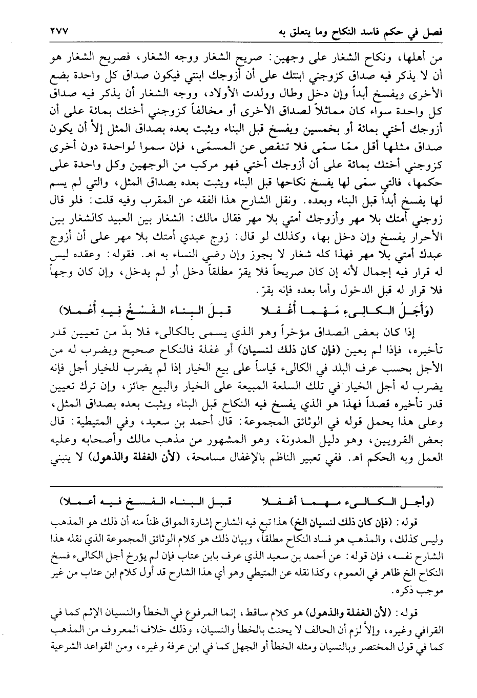 ووجه الشغار أن يذكر فيه صداق كل واحدة سواء كان مماثلا لصداق الأخرى أو مخالفا كزوجني أختك بمائة على أن أزوجك أختي بمائة أو بخمسين ويفسخ قبل البناء ويثبت بعده بصداق المثل إلا أن يكون صداق مثلها أقل مما سمي فلا تنقص عن المسمى فإن سموا لواحدة دون أخرى كزوجني أختك بمائة على أن أزوجك أختي فهو مركب من الوجهين وكل واحدة على حكمها فالتي سمي لها يفسخ نكاحها قبل البناء ويثبت بعده بصداق المثل والتي لم يسم لها يفسخ أبدا قبل البناء وبعده ونقل الشارح هذا الفقه عن المقرب وفيه قلت فلو قال زوجني أمتك بلا مهر وأزوجك أمتي بلا مهر فقال مالك الشغار بين العبيد كالشغار بين الأحرار يفسخ وإن دخل بها وكذلك لو قال زوج عبدي أمتك بلا مهر على أن أزوج عبدك أمتي بلا مهر فهذا كله شغار لا يجوز وإن رضي النساء به ا هـ