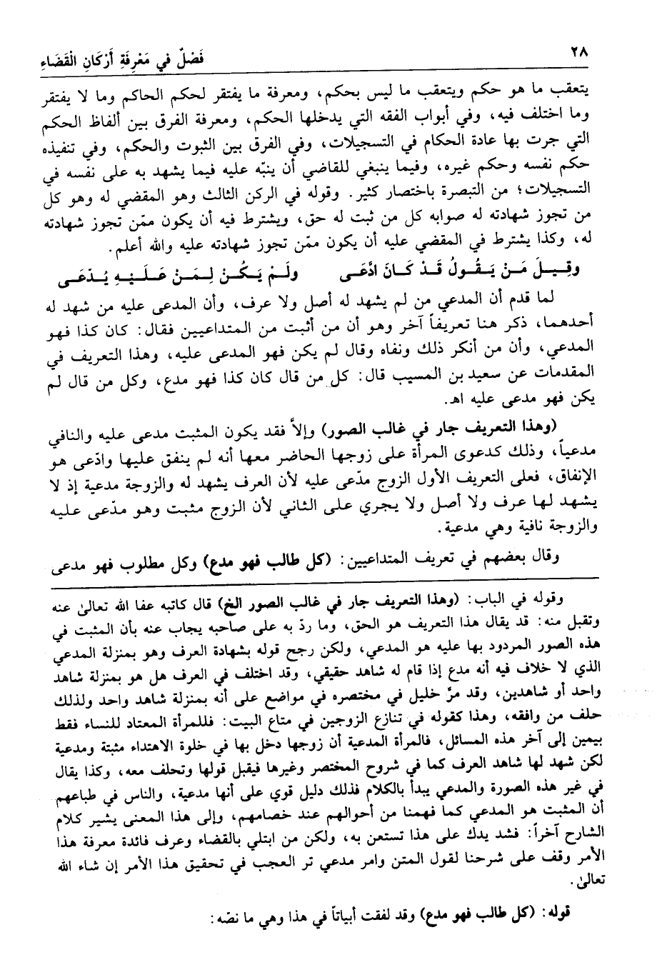 يتعقب ما هو حكم ويتعقب ما ليس بحكم ومعرفة ما يفتقر لحكم الحاكم وما لا يفتقر وما اختلف فيه وفي أبواب الفقه التي يدخلها الحكم ومعرفة الفرق بين ألفاظ الحكم التي جرت بها عادة الحكام في التسجيلات وفي الفرق بين الثبوت والحكم وفي تنفيذه حكم نفسه وحكم غيره وفيما ينبغي للقاضي أن ينبه عليه فيما يشهد به على نفسه في التسجيلات من التبصرة باختصار كثير وقوله في الركن الثالث وهو المقضي له وهو كل من تجوز شهادته له صوابه كل من ثبت له حق ويشترط فيه أن يكون ممن تجوز شهادته له وكذا يشترط في المقضي عليه أن يكون ممن تجوز شهادته عليه والله أعلم وقيل من يقول قد كان ادعى ولم يكن لمن عليه يدعى لما قدم أن المدعي من لم يشهد له أصل ولا عرف وأن المدعى عليه من شهد له أحدهما ذكر هنا تعريفا آخر وهو أن من أثبت من المتداعيين فقال كان كذا فهو المدعي وأن من أنكر ذلك ونفاه وقال لم يكن فهو المدعى عليه وهذا التعريف في المقدمات عن سعيد بن المسيب قال كل من قال كان كذا فهو مدع وكل من قال لم يكن فهو مدعى عليه ا