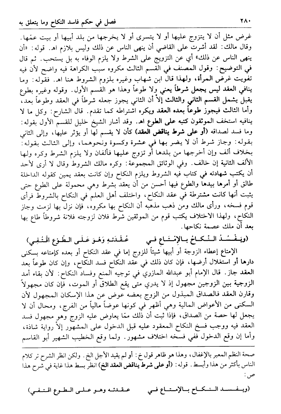 وقد أشار الشيخ خليل للقسم الأول بقوله وما فسد لصداقه أو على شرط يناقض العقد كأن لا يقسم لها أو يؤثر عليها وإلى الثاني بقوله وجاز شرط أن لا يضر بها في عشرة وكسوة ونحوهما وإلى الثالث بقوله بخلاف ألف وإن أخرجها من بلدها أو تزوج عليها فألفان ولا يلزم الشرط وكره ولها الألف الثانية إن خالف وفي الوثائق المجموعة وكره مالك الشروط وقال لا أرى لأحد أن يكتب شهادته في كتاب فيه الشروط ويلزم النكاح وإن كانت بعقد يمين كقوله الداخلة طالق أو أمرها بيدها والطوع فيها أحسن من أن يعقد بشرط وهي محمولة على الطوع حتى يثبت أنها كانت مشترطة في عقد النكاح واختلف أهل العلم في النكاح بالشروط فرأى قوم فسخه ورأى مالك ومن ذهب مذهبه أن النكاح بها مكروه فإن نزل بها لزمت وجاز النكاح ولهذا الاختلاف يكتب قوم من الموثقين شرط فلان لزوجته فلانة شروطا طاع بها بعد أن ملك عصمة نكاحها ويفسد النكاح بالإمتاع في عقدته وهو على الطوع اقتفي الإمتاع إعطاء الزوجة أو أبيها شيئا للزوج إما في عقد النكاح أو بعده كإمتاعه بسكنى دارها أو استغلال أرضها فإن كان ذلك في عقد النكاح فسد النكاح وإن كان طوعا بعد العقد جاز قال الإمام أبو عبد الله المازري في توجيه المنع وفساد النكاح لأن بقاء أمد الزوجية بين الزوجين مجهول إذ لا يدري متى يقع الطلاق أو الموت فإن كان مجهولا وقارن العقد فالصداق المبذول من الزوج بعضه عوض عن هذا الإسكان المجهول لأن السكنى من الأعواض المالية وهي أظهر في كونها عوضا ماليا من الفرج ومحال أن لا يجعل لها حصة من الصداق