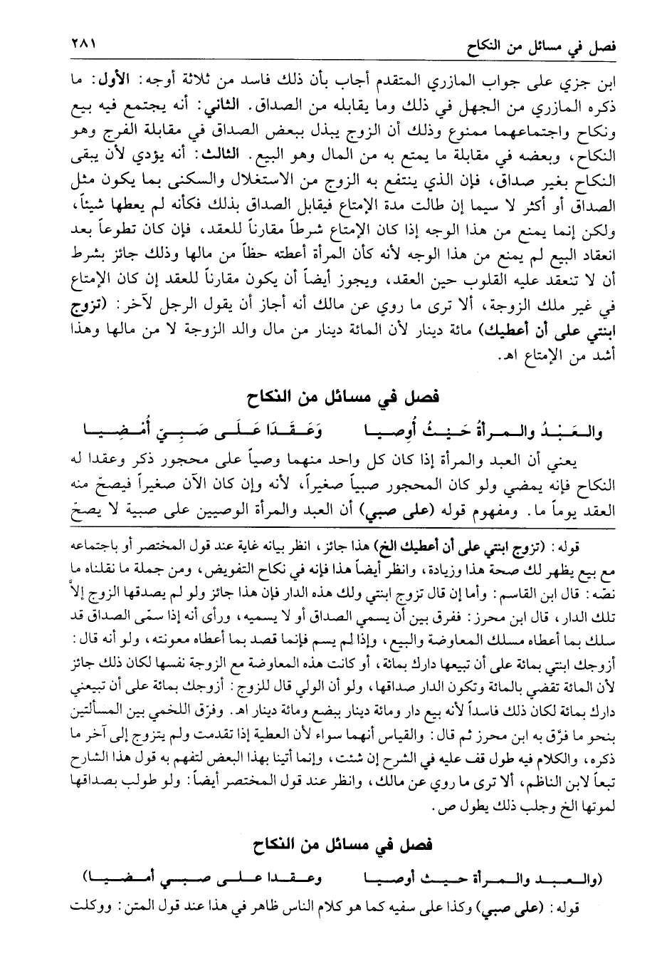 فصل في مسائل من النكاح والعبد والمرأة حيث أوصيا وعقدا على صبي أمضيا يعني أن العبد والمرأة إذا كان كل واحد منهما وصيا على محجور ذكر وعقدا له النكاح فإنه يمضي ولو كان المحجور صبيا صغيرا لأنه وإن كان الآن صغيرا فيصح منه العقد يوما ما ومفهوم قوله على صبي أن العبد والمرأة الوصيين على صبية لا يصح