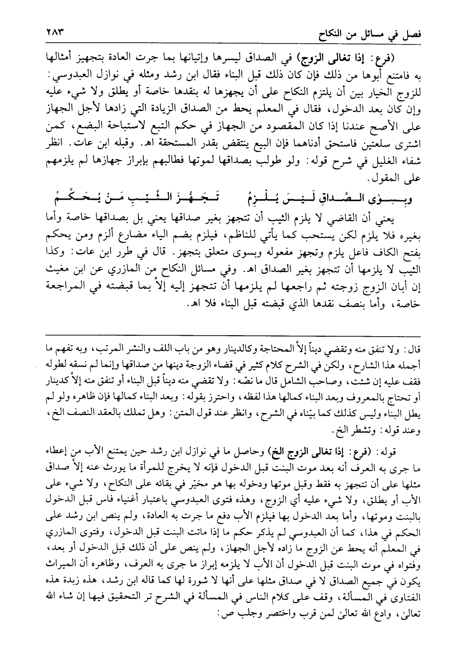 وبسواى الصداق ليس يلزم تجهز الثيب من يحكم يعني أن القاضي لا يلزم الثيب أن تتجهز بغير صداقها يعني بل بصداقها خاصة وأما بغيره فلا يلزم لكن يستحب كما يأتي للناظم فيلزم بضم الياء مضارع ألزم ومن يحكم بفتح الكاف فاعل يلزم وتجهز مفعوله وبسوى متعلق بتجهز قال في طرر ابن عات وكذا الثيب لا يلزمها أن تتجهز بغير الصداق ا هـ وفي مسائل النكاح من المازري عن ابن مغيث إن أبان الزوج زوجته ثم راجعها لم يلزمها أن تتجهز إليه إلا بما قبضته في المراجعة خاصة وأما بنصف نقدها الذي قبضته قبل البناء فلا ا هـ