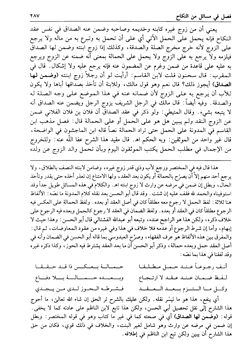قال مقيد هذا الشرح عفا الله عنه وللخروج من الإجمال في مطلب الحمل يكتب الموثقون اليوم وبأن تحمل والد الزوج عن ولده