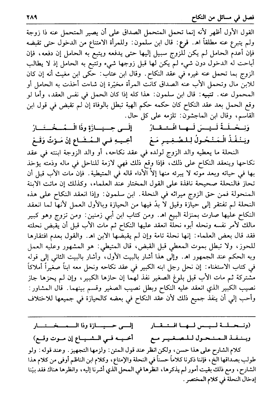 القول الأول أظهر لأنه إنما تحمل المتحمل الصداق على أن يصير المتحمل عنه ذا زوجة ولم يتبرع عنه مطلقا ا هـ فرع قال ابن سلمون وللمرأة الامتناع من الدخول حتى تقبضه فإن أعدم الحامل لم يكن للزوج سبيل إليها حتى يدفعه ويتبع به الحامل إن دفعه فإن أباحت له الدخول دون شيء لم يكن لها قبل زوجها شيء وتتبع به الحامل إذ لا يطالب الزوج بما تحمل عنه غيره في عقد النكاح وقال ابن عتاب حكى ابن مغيث أنه إن كان للابن مال وتحمل الأب عنه الصداق كانت المرأة مخيرة إن شاءت أخذت به الحامل أو المحمول عنه تنبيه قال ابن سلمون هذا كله إذا كان الحمل في نفس العقد وأما لو وقع الحمل بعد عقد النكاح كان حكمه حكم الهبة تبطل بالوفاة إن لم تقبض في قول ابن القاسم وقال ابن الماجشون تلزمه على كل حال ونحلة ليس لها افتقار إلى حيازة وذا المختار وينفذ المنحول للصغير مع أخيه في المشاع إن موت وقع النحلة ما يعطيه والد الزوج لولده في عقد نكاحه أو والد الزوجة ابنته في عقد نكاحها وينعقد النكاح على ذلك فإذا وقع ذلك فهي لازمة للناحل في ماله وذمته يؤخذ بها في حياته وبعد موته لا يبرئه منها إلا الأداء قاله في المتيطية فإن مات الأب قبل أن تحاز فالنحلة صحيحة نافذة على القول المختار عند العلماء وكذلك إن ماتت الابنة المنحولة فمن حق الزوج ميراثه في النحلة ابن سلمون وإذا انعقد النكاح على هذه النحلة لم تفتقر إلى حيازة وقيل لا بد فيها من الحيازة وبالأول العمل لأنها لما انعقد النكاح عليها صارت بمنزلة البيع ا هـ ومن كتاب ابن أبي زمنين ومن تزوج وهو كبير مالك لأمر نفسه ونحله أبوه نحلة انعقد عليها النكاح ثم مات الأب قبل أن يقبض نحلته فقد قال بعض العلماء إنها نحلة تامة وإن لم يقبضها الابن ا هـ والقول بعدم افتقارها للحوز ولا تبطل بموت المعطي قبل القبض قال المتيطي هو المشهور وعليه العمل وبه الحكم عند الجمهور ا هـ وإلى هذا أشار بالبيت الأول وأشار بالبيت الثاني إلى قوله في كتاب الاستغناء إن نحل رجل ابنه الكبير في عقد نكاحه ونحل معه ابنا صغيرا أملاكا مشتركة ثم مات الأب قبل بلوغ الصغير نفذ لهما إن حازها الكبير وإن لم يحزها جاز نصيب الكبير الذي انعقد عليه النكاح وبطل نصيب الصغير وقسم بينهما قال المشاور وأحب إلي أن ينفذ جميع ذلك لأن عقد النكاح في بعضه كالحيازة في جميعها للاختلاف