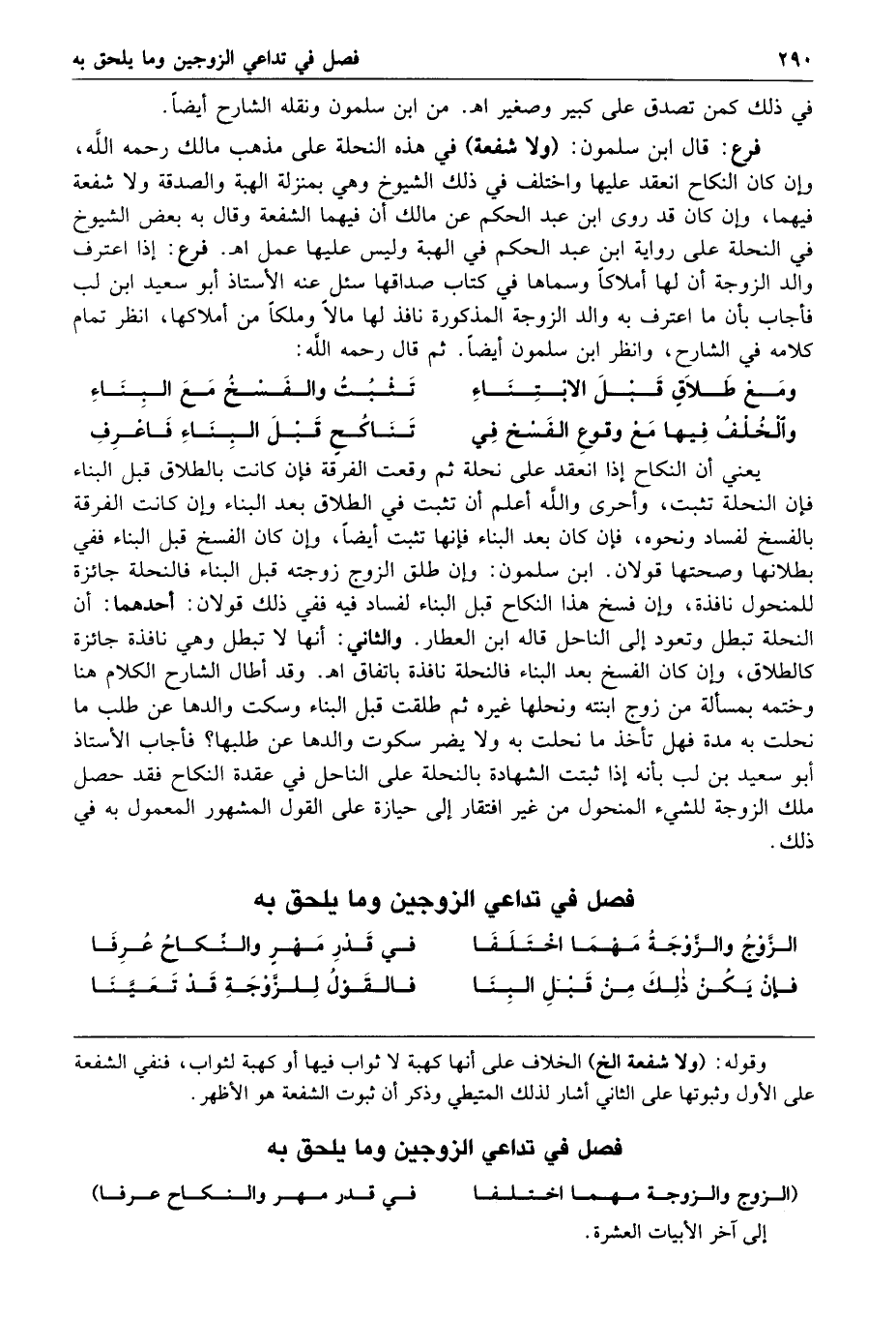 فرع قال ابن سلمون ولا شفعة في هذه النحلة على مذهب مالك رحمه الله وإن كان النكاح انعقد عليها واختلف في ذلك الشيوخ وهي بمنزلة الهبة والصدقة ولا شفعة فيهما وإن كان قد روى ابن عبد الحكم عن مالك أن فيهما الشفعة وقال به بعض الشيوخ في النحلة على رواية ابن عبد الحكم في الهبة وليس عليها عمل ا هـ فرع إذا اعترف والد الزوجة أن لها أملاكا وسماها في كتاب صداقها سئل عنه الأستاذ أبو سعيد ابن لب فأجاب بأن ما اعترف به والد الزوجة المذكورة نافذ لها مالا من مالها وملكا من أملاكها انظر تمام كلامه في الشارح وانظر ابن سلمون أيضا ثم قال رحمه الله ومع طلاق قبل الابتناء تثبت والفسخ مع البناء والخلف فيها مع وقوع الفسخ في تناكح قبل البناء فاعرف يعني أن النكاح إذا انعقد على نحلة ثم وقعت الفرقة فإن كانت بالطلاق قبل البناء فإن النحلة تثبت وأحرى والله أعلم أن تثبت في الطلاق بعد البناء وإن كانت الفرقة بالفسخ لفساد ونحوه فإن كان بعد البناء فإنها تثبت أيضا وإن كان الفسخ قبل البناء ففي بطلانها وصحتها قولان ابن سلمون وإن طلق الزوج زوجته قبل البناء فالنحلة جائزة للمنحول نافذة وإن فسخ هذا النكاح قبل البناء لفساد فيه ففي ذلك قولان أحدهما أن النحلة تبطل وتعود إلى الناحل قاله ابن العطار والثاني أنها لا تبطل وهي نافذة جائزة كالطلاق وإن كان الفسخ بعد البناء فالنحلة نافذة باتفاق ا هـ وقد أطال الشارح الكلام هنا وختمه بمسألة من زوج ابنته ونحلها غيره ثم طلقت قبل البناء وسكت والدها عن طلب ما نحلت به مدة فهل تأخذ ما نحلت به ولا يضر سكوت والدها عن طلبها فأجاب الأستاذ أبو سعيد بن لب بأنه إذا ثبتت الشهادة بالنحلة على الناحل في عقدة النكاح فقد حصل ملك الزوجة للشيء المنحول من غير افتقار إلى حيازة على القول المشهور المعمول به في ذلك فصل في تداعي الزوجين وما يلحق به الزوج والزوجة مهما اختلفا في قدر مهر والنكاح عرفا فإن يكن ذلك من قبل البنا فالقول للزوجة قد تعينا