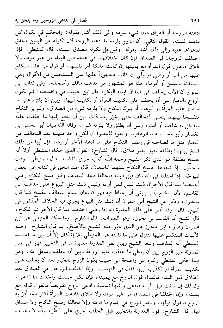 قال ابن حبيب في واضحته ثم يكون الزوج بالخيار بين أن يحلف على تكذيب المرأة أو تكذيب أبيها وبين أن يلتزم على ما حلفت عليه المرأة أو أبوها أو يترك النكاح ولا يلزمه شيء من الصداق ولم ير النكاح منفسخا بينهما بنفس التحالف حتى يخير بعد ذلك بين أن يدفع إليها ما حلفت عليه ويدخل به شاءت أو أبت وبين أن يطلق ولا يلزمه شيء وقاله القاضيان أبو الحسن بن القصار و أبو محمد عبد الوهاب ونحوه للمغيرة أن لكل واحد منهما بعد التحالف من الخيار مثل ما لصاحبه في إمضاء النكاح على ما ادعاه الآخر أو رده فإن أبيا من ذلك فسخ بينهما بطلقة وقيل بغير طلاق قال الشارح القول الذي حكاه المتيطي أولا أنه يفسخ بطلقة هو الذي ذكر الشيخ رحمه الله أنه به جرى القضاء قال المتيطي وقال سحنون إذا تحالفا انفسخ النكاح بينهما كاللعان قال عبد الحق في كتابه عن بعض شيوخه إذا اختلفا في الصداق قبل البناء فتحالفا فبعد التحالف وقبل فسخ النكاح رضي أحدهما بما قال الآخران ذلك ليس لمن أراده وليس ذلك مثل البيوع على مذهب ابن القاسم لأن النكاح باب ينبغي أن يحتاط فيه فهو كاللعان بتمام التحالف ينفسخ كما قال سحنون وذكر عن الشيخ أبي عمران أن ذلك مثل البيوع يجري فيه الخلاف المذكور في البيع قال وقد نص على ذلك المغيرة أنه إذا رضي أحدهما بما قال الآخر تم النكاح قال الشيخ أبو القاسم بن محرز وهو الصواب
