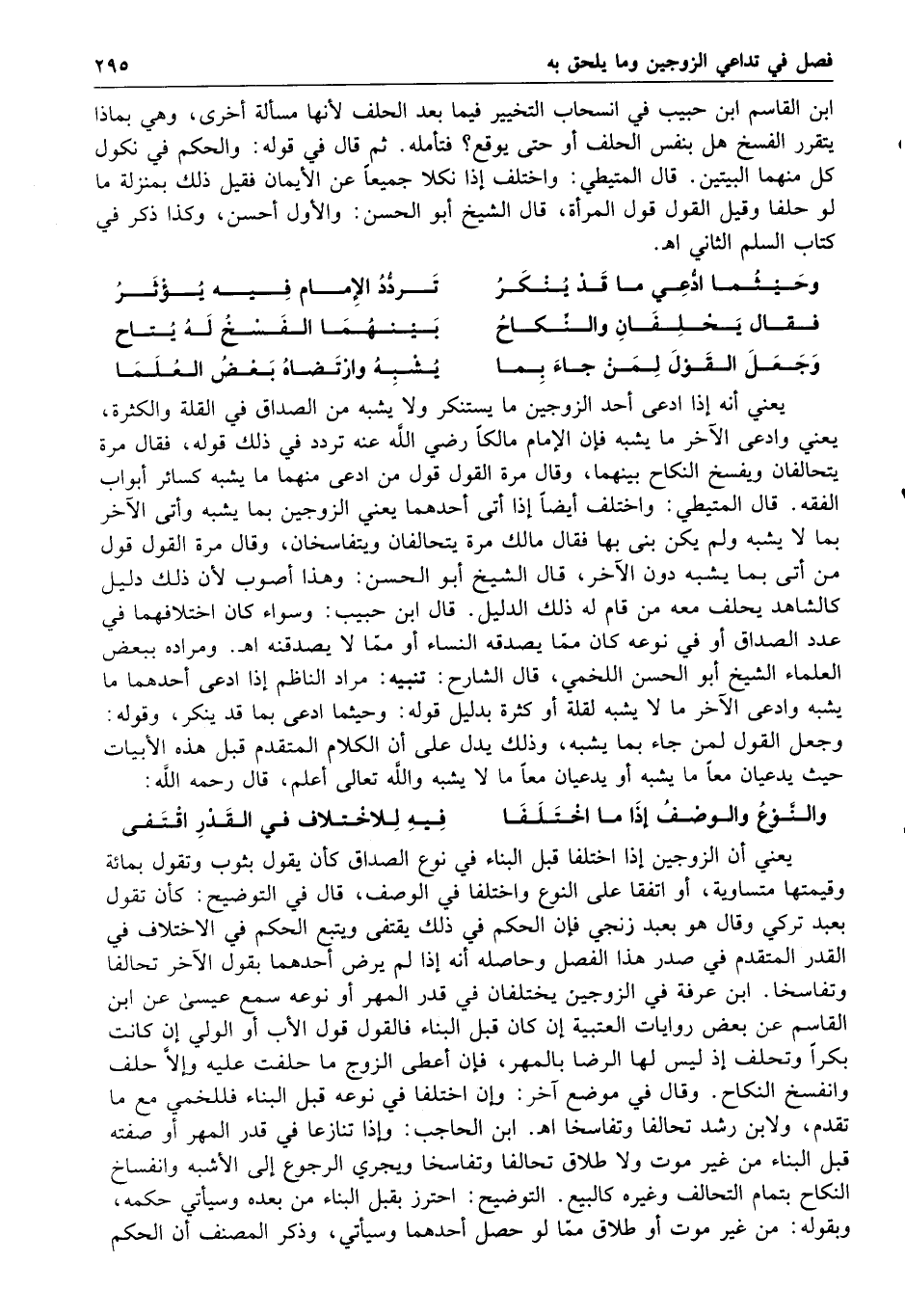 وحيثما ادعى ما قد ينكر تردد الإمام فيه يؤثر فقال يحلفان والنكاح بينهما الفسخ له يتاح وجعل القول لمن جاء بما يشبه وارتضاه بعض العلما يعني أنه إذا ادعى أحد الزوجين ما يستنكر ولا يشبه من الصداق في القلة والكثرة يعني وادعى الآخر ما يشبه فإن الإمام مالكا رضي الله عنه تردد في ذلك قوله فقال مرة يتحالفان ويفسخ النكاح بينهما وقال مرة القول قول من ادعى منهما ما يشبه كسائر أبواب الفقه قال المتيطي واختلف أيضا إذا أتى أحدهما يعني الزوجين بما يشبه وأتى الآخر بما لا يشبه ولم يكن بنى بها فقال مالك مرة يتحالفان ويتفاسخان وقال مرة القول قول من أتى بما يشبه دون الآخر قال الشيخ أبو الحسن وهذا أصوب لأن ذلك دليل كالشاهد يحلف معه من قام له ذلك الدليل قال ابن حبيب وسواء كان اختلافهما في عدد الصداق أو في نوعه كان مما يصدقه النساء أو مما لا يصدقنه ا هـ ومراده ببعض العلماء الشيخ أبو الحسن اللخمي قال الشارح تنبيه مراد الناظم إذا ادعى أحدهما ما يشبه وادعى الآخر ما لا يشبه لقلة أو كثرة بدليل قوله وحيثما ادعى بما قد ينكر وقوله وجعل القول لمن جاء بما يشبه وذلك يدل على أن الكلام المتقدم قبل هذه الأبيات حيث يدعيان معا ما يشبه أو يدعيان معا ما لا يشبه والله تعالى أعلم قال رحمه الله والنوع والوصف إذا ما اختلفا فيه للاختلاف في القدر اقتفى يعني أن الزوجين إذا اختلفا قبل البناء في نوع الصداق كأن يقول بثوب وتقول بمائة وقيمتها متساوية أو اتفقا على النوع واختلفا في الوصف قال في التوضيح كأن تقول بعبد تركي وقال هو بعبد زنجي فإن الحكم في ذلك يقتفي ويتبع الحكم في الاختلاف في القدر المتقدم في صدر هذا الفصل وحاصله إنه إذا لم يرض أحدهما بقول الآخر تحالفا وتفاسخا ابن عرفة في الزوجين يختلفان في قدر المهر أو نوعه سمع عيسى عن ابن القاسم عن بعض روايات العتبية إن كان قبل البناء فالقول قول الأب أو الولي إن كانت بكرا وتحلف إذ ليس لها الرضا بالمهر فإن أعطى الزوج ما حلفت عليه وإلا حلف وانفسخ النكاح وقال في موضع آخر وإن اختلفا في نوعه قبل البناء فللخمي مع ما تقدم ولابن رشد تحالفا وتفاسخا ا هـ ابن الحاجب وإذا تنازعا في قدر المهر أو صفته قبل البناء من غير موت ولا طلاق تحالفا وتفاسخا ويجري الرجوع إلى الأشبه وانفساخ النكاح بتمام التحالف وغيره كالبيع التوضيح احترز بقبل البناء من بعده وسيأتي حكمه وبقوله من غير موت أو طلاق مما لو حصل أحدهما وسيأتي وذكر المصنف أن الحكم