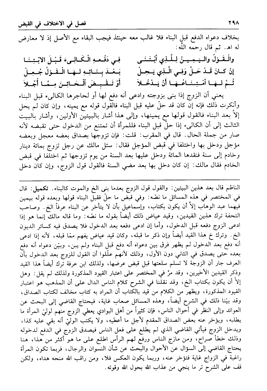 بخلاف دعواه الدفع قبل البناء فلا غالب معه حينئذ فيجب البقاء مع الأصل إذ لا معارض له ا هـ ثم قال رحمه الله والقول واليمين للذي ابتنى في دفعه الكالئ قبل الابتنا إن كان قد حل وفي الذي يحل بعد بنائه لها القول جعل ثم لها امتناعها أن يدخلا أو تقبض الحائن مما أجلا يعنى أن الزوج إذا بنى بزوجته وادعى أنه دفع لها أو لحاجرها الكالئ قبل البناء وأنكرت ذلك فإنه إن كان قد حل عليه قبل البناء فالقول قوله مع يمينه وإن كان لم يحل إلا بعد البناء فالقول قولها مع يمينها وإلى هذا أشار بالبيتين الأولين وأشار بالبيت الثالث إلى أن الكالئ إذا حل قبل البناء فللمرأة أن تمتنع من الدخول حتى تقبضه لأنه صار من جملة الحال قال في المقرب قلت فإن تزوجها بصداق بعضه معجل وبعضه مؤجل ودخل بها واختلفا في قبض المؤجل فقال سئل مالك عن رجل تزوج بمائة دينار وخادم إلى سنة فنقدها المائة ودخل عليها بعد السنة من يوم تزوجها ثم اختلفا في قبض الخادم فقال مالك إن كان دخل