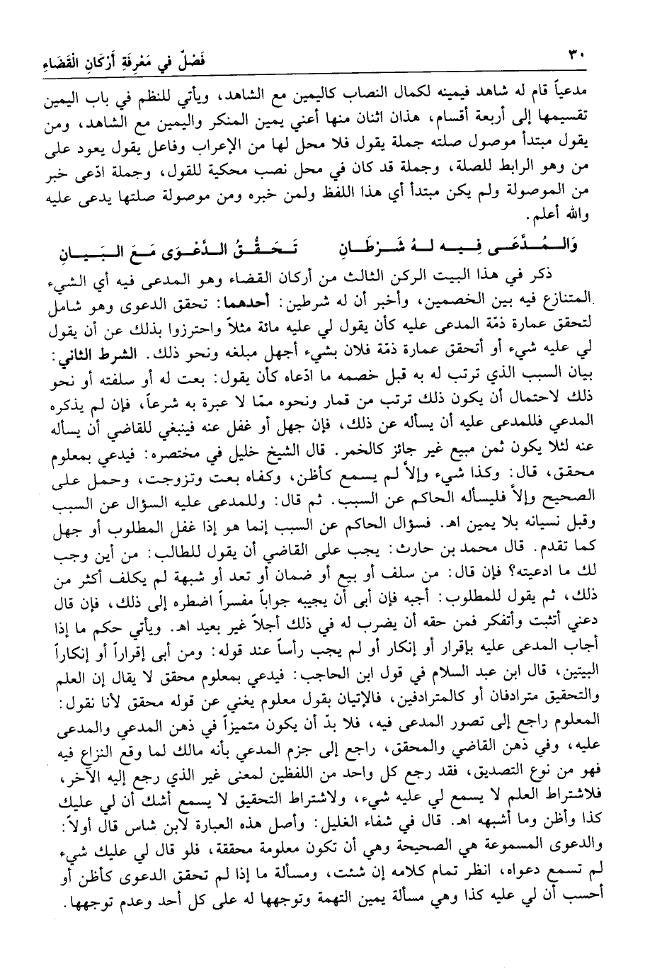 وجملة ادعى خبر من الموصولة ولم يكن مبتدأ أي هذا اللفظ ولمن خبره ومن موصولة صلتها يدعى عليه والله أعلم والمدعى فيه له شرطان تحقق الدعوى مع البيان ذكر في هذا البيت الركن الثالث من أركان القضاء وهو المدعى فيه أي الشيء المتنازع فيه بين الخصمين وأخبر أن له شرطين أحدهما تحقق الدعوى وهو شامل لتحقق عمارة ذمة المدعى عليه كأن يقول لي عليه مائة مثلا واحترزوا بذلك عن أن يقول لي عليه شيء أو أتحقق عمارة ذمة فلان بشيء أجهل مبلغه ونحو ذلك