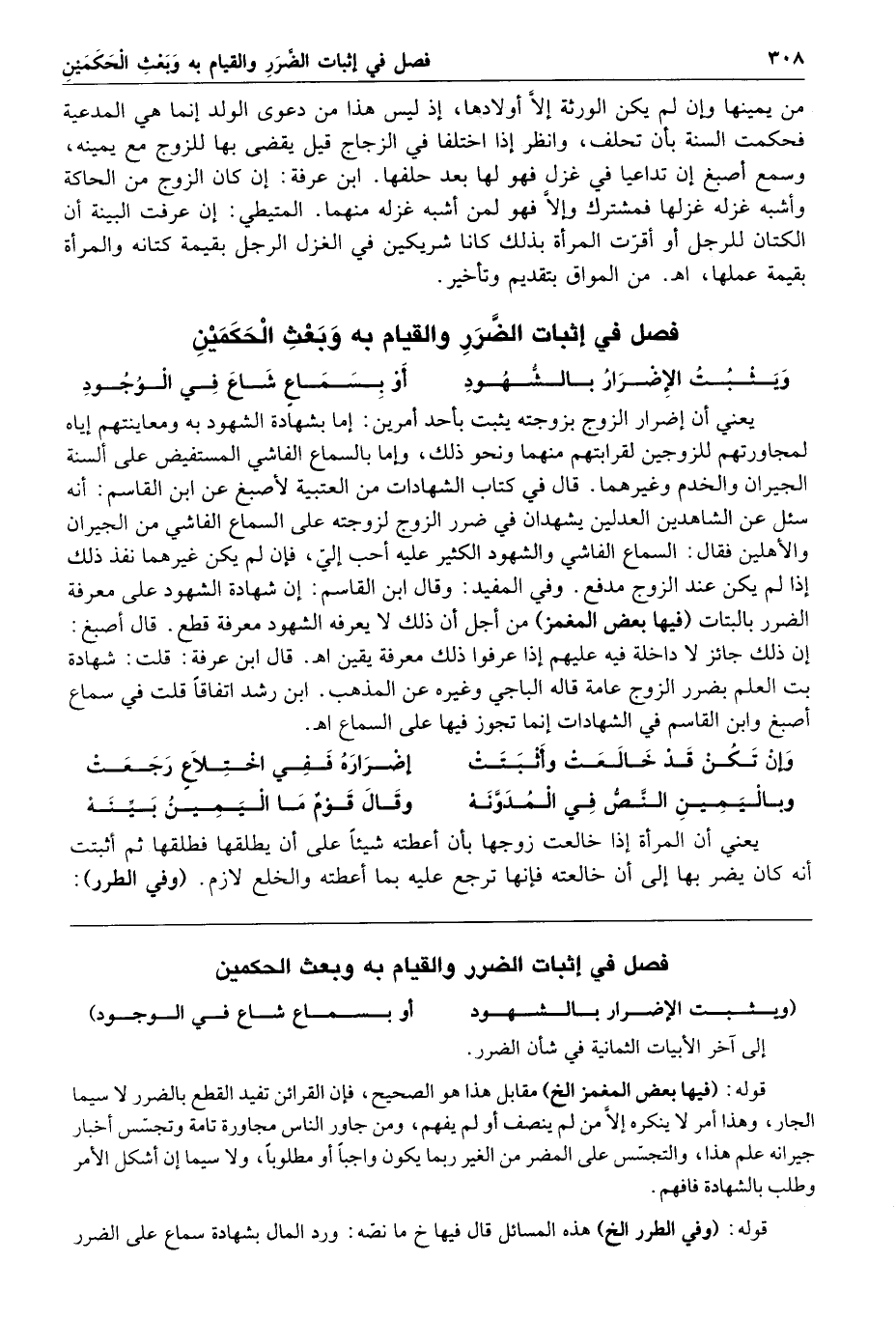 من يمينها وإن لم يكن الورثة إلا أولادها إذ ليس هذا من دعوى الولد إنما هي المدعية فحكمت السنة بأن تحلف وانظر إذا اختلفا في الزجاج قيل يقضى بها للزوج مع يمينه وسمع أصبغ إن تداعيا في غزل فهو لها بعد حلفها ابن عرفة إن كان الزوج من الحاكة وأشبه غزله غزلها فمشترك وإلا فهو لمن أشبه غزله منهما المتيطي إن عرفت البينة أن الكتان للرجل أو أقرت المرأة بذلك كانا شريكين في الغزل الرجل بقيمة كتانه والمرأة بقيمة عملها ا هـ من المواق بتقديم وتأخير فصل في إثبات الضرر والقيام به وبعث الحكمين ويثبت الإضرار بالشهود أو بسماع شاع في الوجود يعني أن إضرار الزوج بزوجته يثبت بأحد أمرين إما بشهادة الشهود به ومعاينتهم إياه لمجاورتهم للزوجين لقرابتهم منهما ونحو ذلك وإما بالسماع الفاشي المستفيض على ألسنة الجيران والخدم وغيرهما قال في كتاب الشهادات من العتبية لأصبغ عن ابن القاسم أنه سأل عن الشاهدين العدلين يشهدان في ضرر الزوج لزوجته على السماع الفاشي من الجيران والأهلين فقال السماع الفاشي والشهود الكثير عليه أحب إلي فإن لم يكن غيرهما نفذ ذلك إذا لم يكن عند الزوج مدفع وفي المفيد وقال ابن القاسم إن شهادة الشهود على معرفة الضرر بالبتات فيها بعض المغمز من أجل أن ذلك لا يعرفه الشهود معرفة قطع قال أصبغ إن ذلك جائز لا داخلة فيه عليهم إذا عرفوا ذلك معرفة يقين
