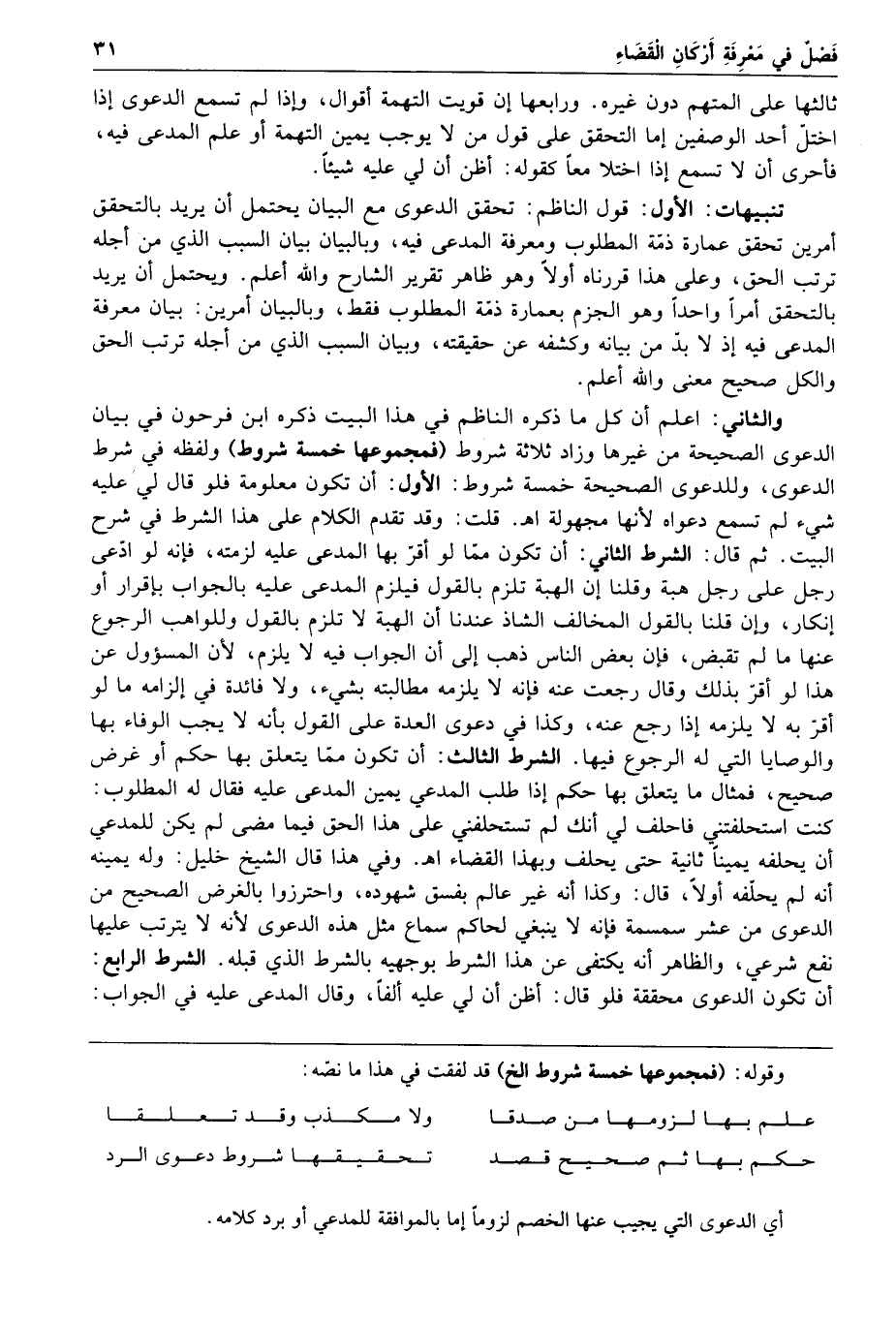 والثاني اعلم أن كل ما ذكره الناظم في هذا البيت ذكره ابن فرحون في بيان الدعوى الصحيحة من غيرها وزاد ثلاثة شروط فمجموعها خمسة شروط ولفظه في شرط الدعوى وللدعوى الصحيحة خمسة شروط الأول أن تكون معلومة فلو قال لي عليه شيء لم تسمع دعواه لأنها مجهولة ا هـ