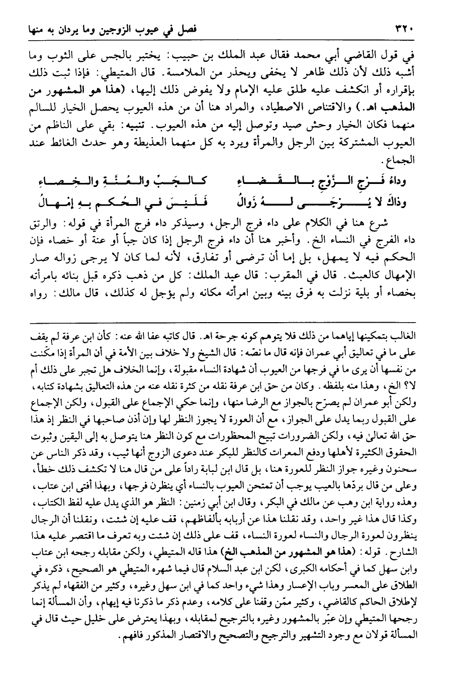 في قول القاضي أبي محمد فقال عبد الملك بن حبيب يختبر بالجس على الثوب وما أشبه ذلك لأن ذلك ظاهر لا يخفى ويحذر من الملامسة قال المتيطي فإذا ثبت ذلك بإقراره أو انكشف عليه طلق عليه الإمام ولا يفوض ذلك إليها هذا هو المشهور من المذهب ا هـ والاقتناص الاصطياد والمراد هنا أن من هذه العيوب يحصل الخيار للسالم منهما فكأن الخيار وحش صيد وتوصل إليه من هذه العيوب تنبيه بقي على الناظم من العيوب المشتركة بين الرجل والمرأة ويرد به كل منهما العذيطة وهو حدث الغائط عند الجماع وداء فرج الزوج بالقضاء كالجب والعنة والخصاء وذاك لا يرجى له زوال فليس في الحكم به إمهال شرع هنا في الكلام على داء فرج الرجل وسيذكر داء فرج المرأة في قوله والرتق داء الفرج في النساء إلخ وأخبر هنا أن داء فرج الرجل إذا كان جبا أو عنة أو خصاء فإن الحكم فيه لا يمهل بل إما أن ترضى أو تفارق لأنه لما كان لا يرجى زواله صار الإمهال كالعبث قال في المقرب قال عبد الملك كل من ذهب ذكره قبل بنائه بامرأته بخصاء أو بلية نزلت به فرق بينه وبين امرأته مكانه ولم يؤجل له كذلك قال مالك رواه