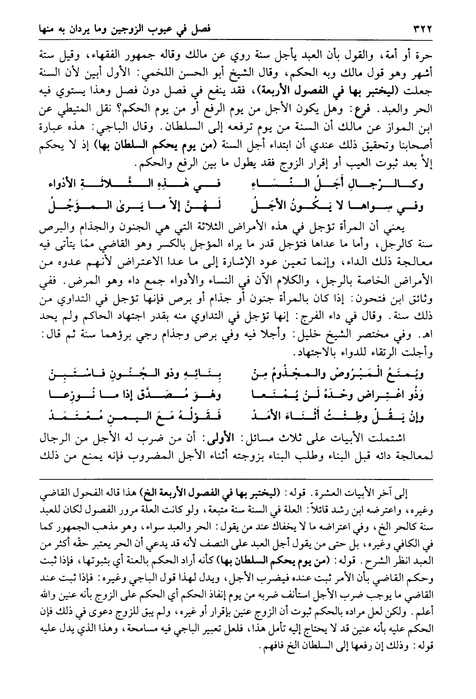 حرة أو أمة والقول بأن العبد يؤجل سنة روي عن مالك وقاله جمهور الفقهاء وقيل ستة أشهر وهو قول مالك وبه الحكم وقال الشيخ أبو الحسن اللخمي الأول أبين لأن السنة جعلت ليختبر بها في الفصول الأربعة فقد ينفع في فصل دون فصل وهذا يستوي فيه الحر والعبد