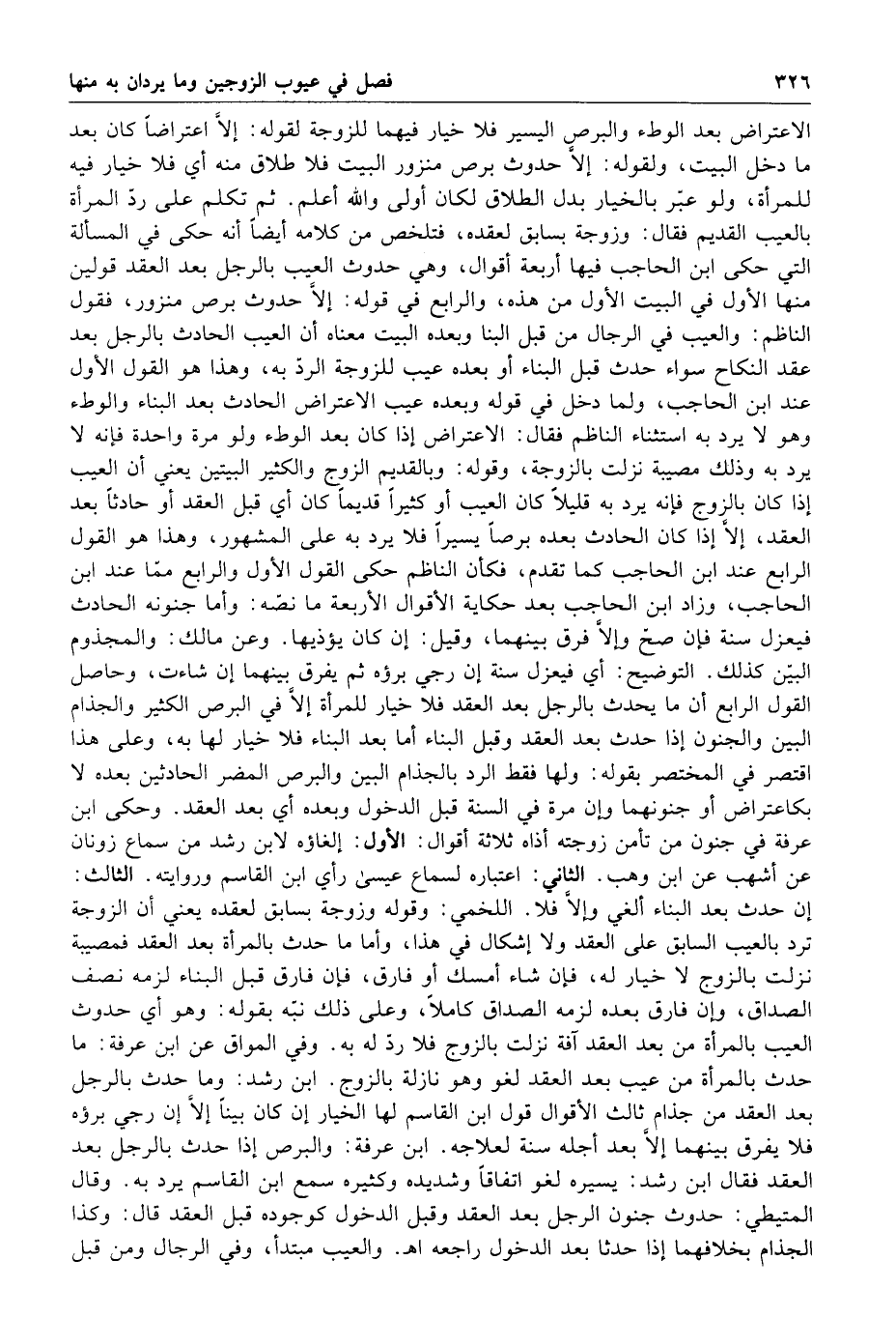 وحاصل القول الرابع أن ما يحدث بالرجل بعد العقد فلا خيار للمرأة إلا في البرص الكثير والجذام البين والجنون إذا حدث بعد العقد وقبل البناء أما بعد البناء فلا خيار لها به وعلى هذا اقتصر في المختصر بقوله ولها فقط الرد بالجذام البين والبرص المضر الحادثين بعده لا بكاعتراض أو جنونهما وإن مرة في السنة قبل الدخول وبعده أي بعد العقد وحكى ابن عرفة في جنون من تأمن زوجته أذاه ثلاثة أقوال الأول إلغاؤه لابن رشد من سماع زونان عن أشهب عن ابن وهب الثاني اعتباره لسماع عيسى رأى ابن القاسم وروايته الثالث إن حدث بعد البناء ألغي وإلا فلا اللخمي وقوله وزوجة بسابق لعقده يعني أن الزوجة ترد بالعيب السابق على العقد ولا إشكال في هذا وأما ما حدث بالمرأة بعد العقد فمصيبة نزلت بالزوج لا خيار له فإن شاء أمسك أو فارق فإن فارق قبل البناء لزمه نصف الصداق وإن فارق بعده لزمه الصداق كاملا