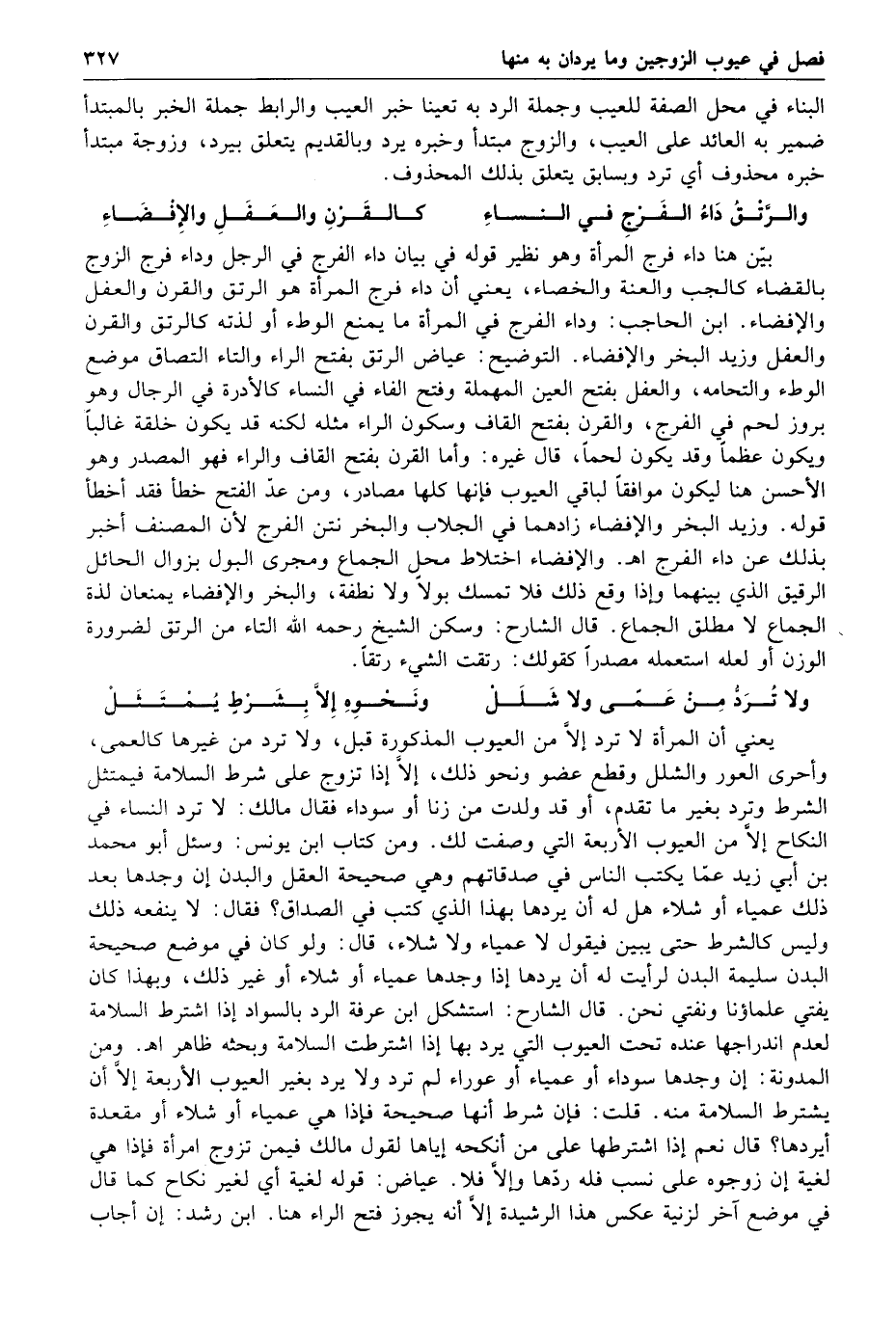 البناء في محل الصفة للعيب وجملة الرد به تعينا خبر العيب والرابط جملة الخبر بالمبتدأ ضمير به العائد على العيب والزوج مبتدأ وخبره يرد وبالقديم يتعلق بيرد وزوجة مبتدأ خبره محذوف أي ترد وبسابق يتعلق بذلك المحذوف والرتق داء الفرج في النساء كالقرن والعفل والإفضاء بين هنا داء فرج المرأة وهو نظير قوله في بيان داء الفرج في الرجل وداء فرج الزوج بالقضاء كالجب والعنة والخصاء يعني أن داء فرج المرأة هو الرتق والقرن والعفل والإفضاء ابن الحاجب وداء الفرج في المرأة ما يمنع الوطء أو لذته كالرتق والقرن والعفل وزيد البخر والإفضاء التوضيح عياض الرتق بفتح الراء والتاء التصاق موضع الوطء والتحامه والعفل بفتح العين المهملة وفتح الفاء في النساء كالأدرة في الرجال وهو بروز لحم في الفرج والقرن بفتح القاف وسكون الراء مثله لكنه قد يكون خلقة غالبا ويكون عظما وقد يكون لحما قال غيره وأما القرن بفتح القاف والراء فهو المصدر وهو الأحسن هنا ليكون موافقا لباقي العيوب فإنها كلها مصادر ومن عد الفتح خطأ فقد أخطأ قوله وزيد البخر والإفضاء زادهما في الجلاب والبخر نتن الفرج لأن المصنف أخبر بذلك عن داء الفرج ا هـ والإفضاء اختلاط محل الجماع ومجرى البول بزوال الحائل الرقيق الذي بينهما وإذا وقع ذلك فلا تمسك بولا ولا نطفة والبخر والإفضاء يمنعان لذة الجماع لا مطلق الجماع قال الشارح وسكن الشيخ رحمه الله التاء من الرتق لضرورة الوزن أو لعله استعمله مصدرا كقولك رتقت الشيء رتقا ولا ترد من عمى ولا شلل ونحوه إلا بشرط يمتثل يعني أن المرأة لا ترد إلا من العيوب المذكورة قبل ولا ترد من غيرها كالعمى وأحرى العور والشلل وقطع عضو ونحو ذلك إلا إذا تزوج على شرط السلامة فيمتثل الشرط وترد بغير ما تقدم أو قد ولدت من زنا أو سوداء فقال مالك لا ترد النساء في النكاح إلا من العيوب الأربعة التي وصفت لك ومن كتاب ابن يونس وسئل أبو محمد بن أبي زيد عما يكتب الناس في صدقاتهم وهي صحيحة العقل والبدن إن وجدها بعد ذلك عمياء أو شلاء هل له أن يردها بهذا الذي كتب في الصداق فقال لا ينفعه ذلك وليس كالشرط حتى يبين فيقول لا عمياء ولا شلاء قال ولو كان في موضع صحيحة البدن سليمة البدن لرأيت له أن يردها إذا وجدها عمياء أو شلاء أو غير ذلك وبهذا كان يفتي علماؤنا ونفتي نحن قال الشارح استشكل ابن عرفة الرد بالسواد إذا اشترط السلامة لعدم اندراجها عنده تحت العيوب التي يرد بها إذا اشترطت السلامة وبحثه ظاهر