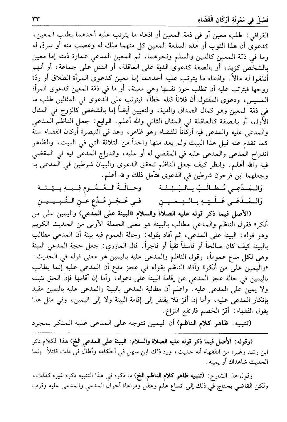 قال المازري جعل حجة المدعي البينة وهي لكل مدع عموما وقول الناظم والمدعى عليه باليمين هو معنى قوله في الحديث واليمين على من أنكر وأفاد الناظم بقوله في عجز مدع أن المدعى عليه إنما يطالب باليمين في حالة عجز المدعي عن إقامة البينة على دعواه وأما إن أقامها فإن الحق يثبت ولا يمين على المدعى عليه