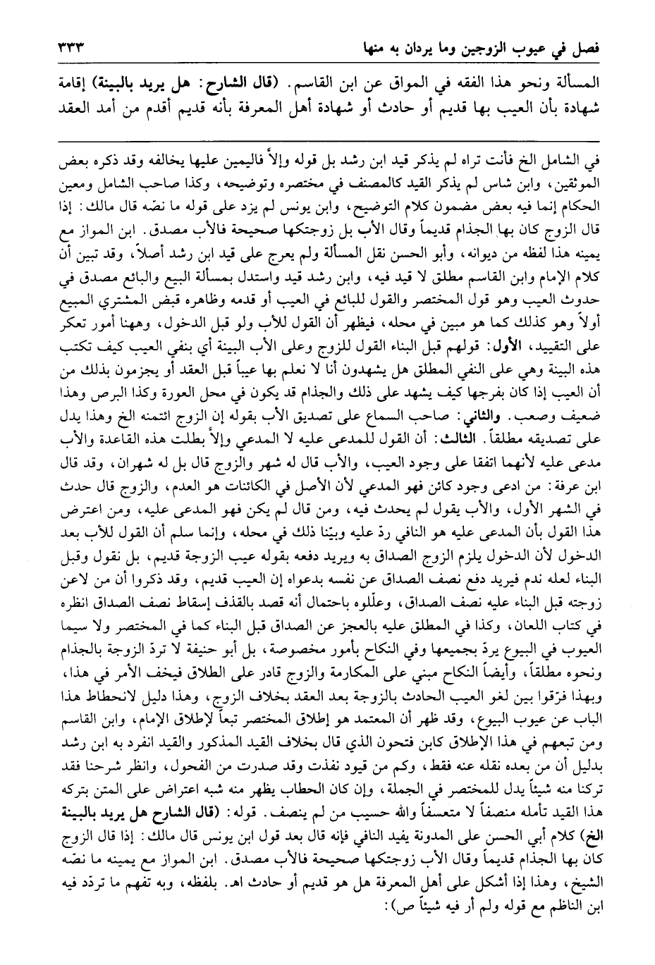 333 المسألة ونحو هذا الفقه في المواق عن ابن القاسم قال الشارح هل يريد بالبينة إقامة شهادة بأن العيب بها قديم أو حادث أو شهادة أهل المعرفة بأنه قديم أقدم من أمد العقد