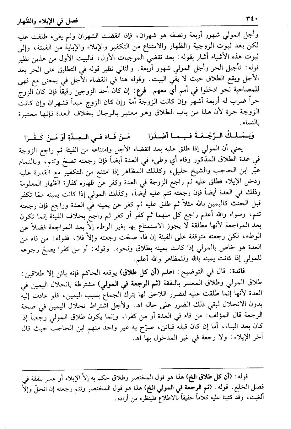 وأجل المولي شهور أربعه ونصفه هو شهران فإذا انقضت الشهران ولم يفئ طلقت عليه لكن بعد ثبوت الزوجية والظهار والامتناع من التكفير والإيلاء والإباية من الفيئة وإلى ثبوت هذه الأشياء أشار بقوله بعد تقضي الموجبات الأول فالبيت الأول من هذين نظير قوله تأجيل الحر وأجل المولي شهور أربعه