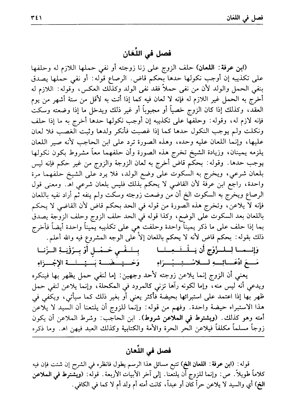 341 فصل في اللعان ابن عرفة اللعان حلف الزوج على زنا زوجته أو نفي حملها اللازم له وحلفها على تكذيبه إن أوجب نكولها حدها بحكم قاض الرصاع قوله أو نفي حملها يصدق بنفي الحمل والولد لأن من نفى حملا فقد نفى الولد وكذلك العكس وقوله اللازم له أخرج به الحمل غير اللازم له فإنه لا لعان فيه كما إذا أتت به لأقل من ستة أشهر من يوم العقد وكذلك إذا كان الزوج خصيا أو مجبوبا أو غير ذلك ويدخل ما إذا وضعته وسكت فإنه لازم له