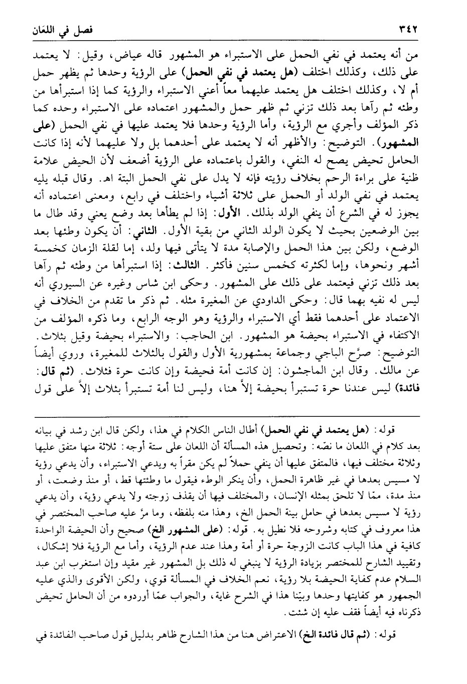 التوضيح والأظهر أنه لا يعتمد على أحدهما بل ولا عليهما لأنه إذا كانت الحامل تحيض يصح له النفي
