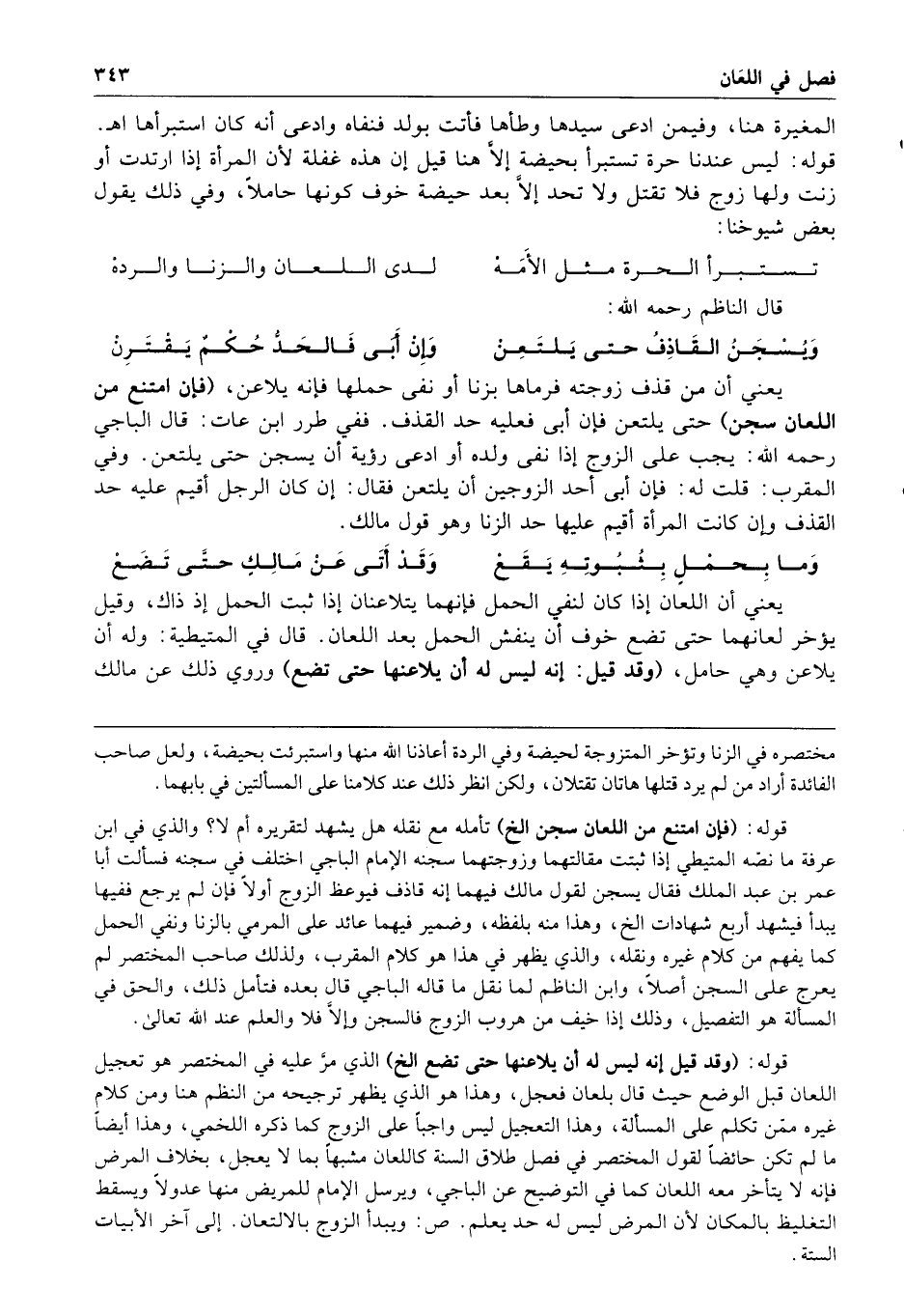 وقيل يؤخر لعانهما حتى تضع خوف أن ينفش الحمل بعد اللعان قال في المتيطية وله أن يلاعن وهي حامل وقد قيل إنه ليس له أن يلاعنها حتى تضع