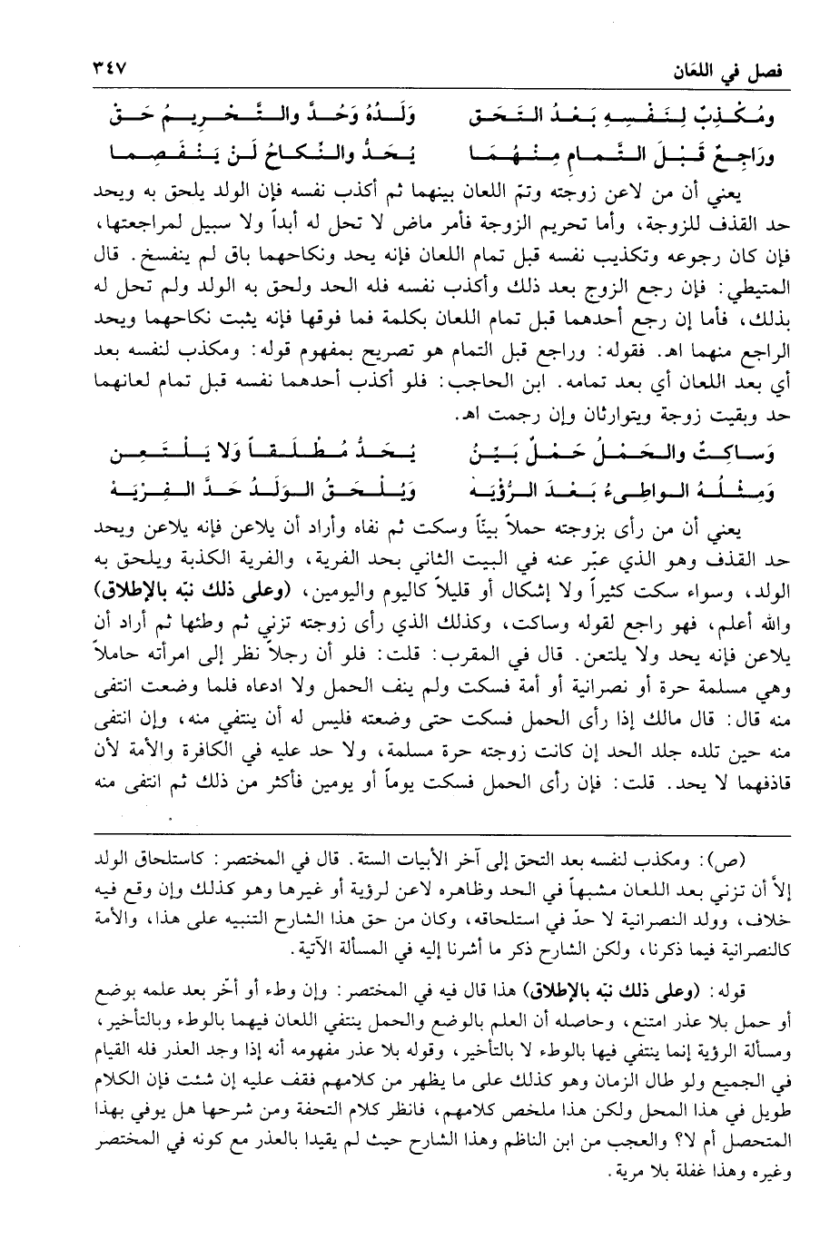 وساكت والحمل حمل بين يحد مطلقا ولا يلتعن ومثله الواطئ بعد الرؤية ويلحق الولد وحد الفرية يعني أن من رأى بزوجته حملا بينا وسكت ثم نفاه وأراد أن يلاعن فإنه يلاعن ويحد حد القذف وهو الذي عبر عنه في البيت الثاني بحد الفرية