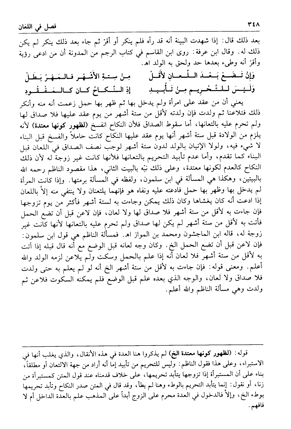 وأما عدم تأبيد التحريم بالتعانها فلأنها كانت غير زوجة له لأن ذلك النكاح كالعدم لكونها معتدة وعلى ذلك نبه بالبيت الثاني