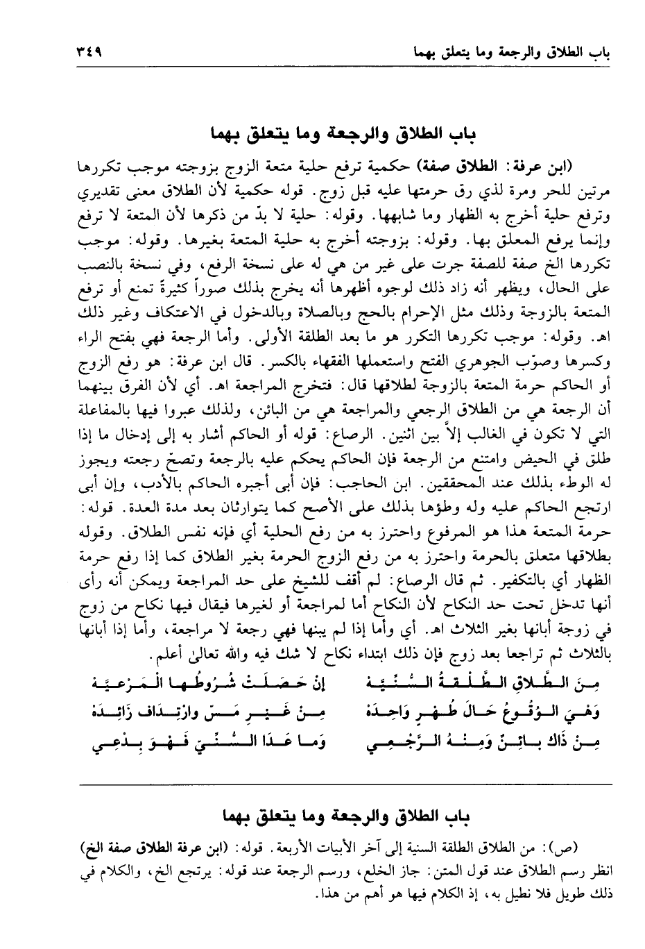 349 باب الطلاق والرجعة وما يتعلق بهما ابن عرفة الطلاق صفة حكمية ترفع حلية متعة الزوج بزوجته موجب تكررها مرتين للحر ومرة لذي رق حرمتها عليه قبل زوج