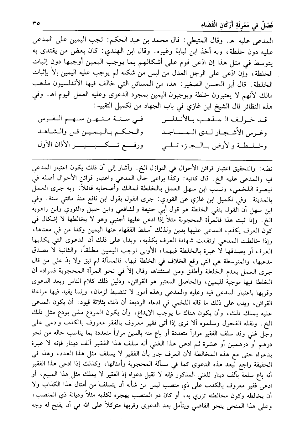وفي هذه النظائر قال الشيخ ابن غازي في باب الجهاد من تكميل التقييد قد خولف المذهب بالأندلس في ستة منهن سهم الفرس وغرس الأشجار لدى المساجد والحكم باليمين قل والشاهد وخلطة والأرض بالجزء تلي ورفع تكبير الأذان الأول